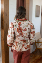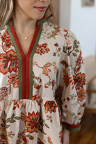 This rust cream and olive botanical print top brings fresh charm to your wardrobe with its playful ¾ sleeves and flattering peplum waist. The contrast binding along the V-neck adds a stylish touch, while the lightweight woven fabric keeps it comfortable and breezy. Perfect for days when you want to feel effortlessly chic!