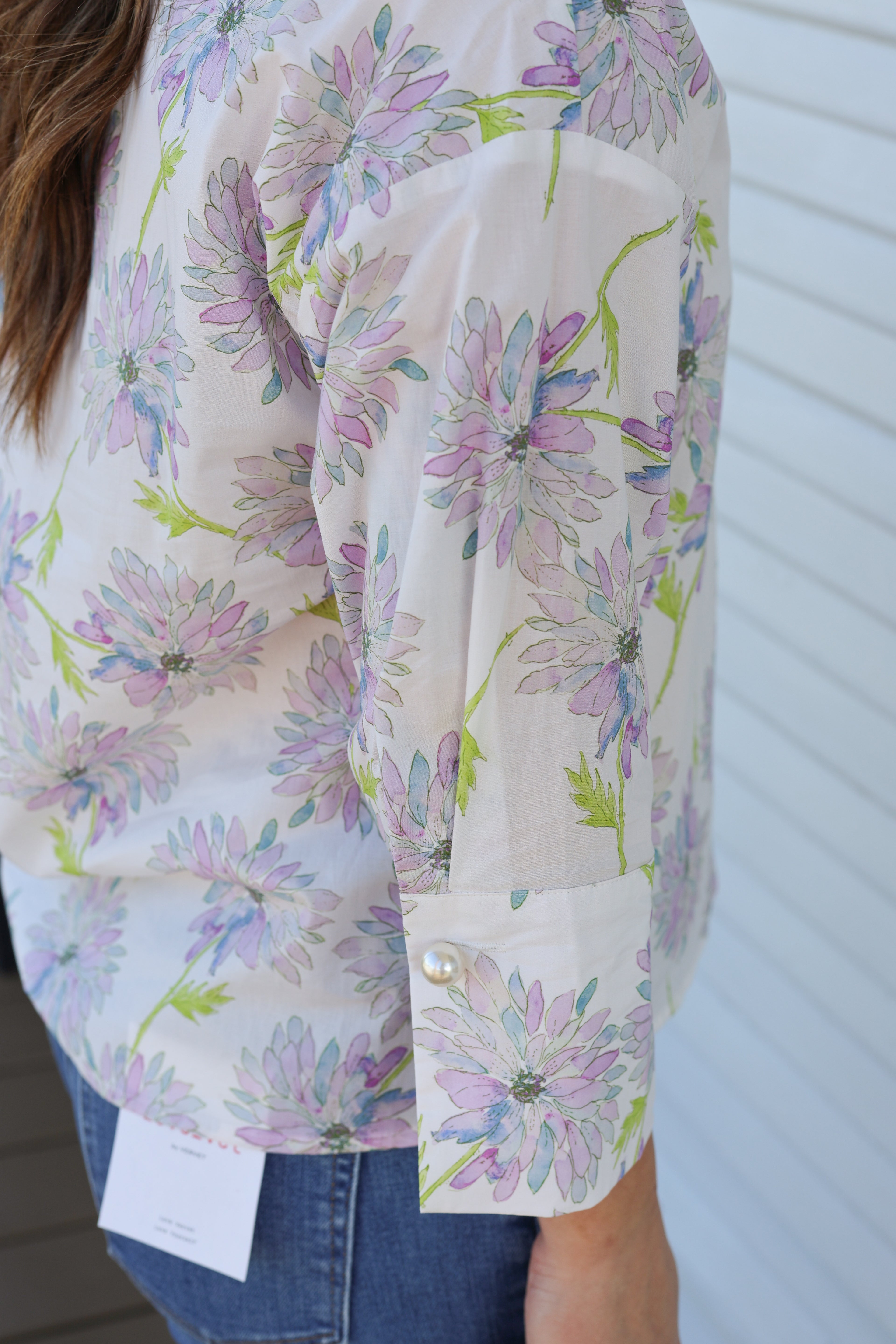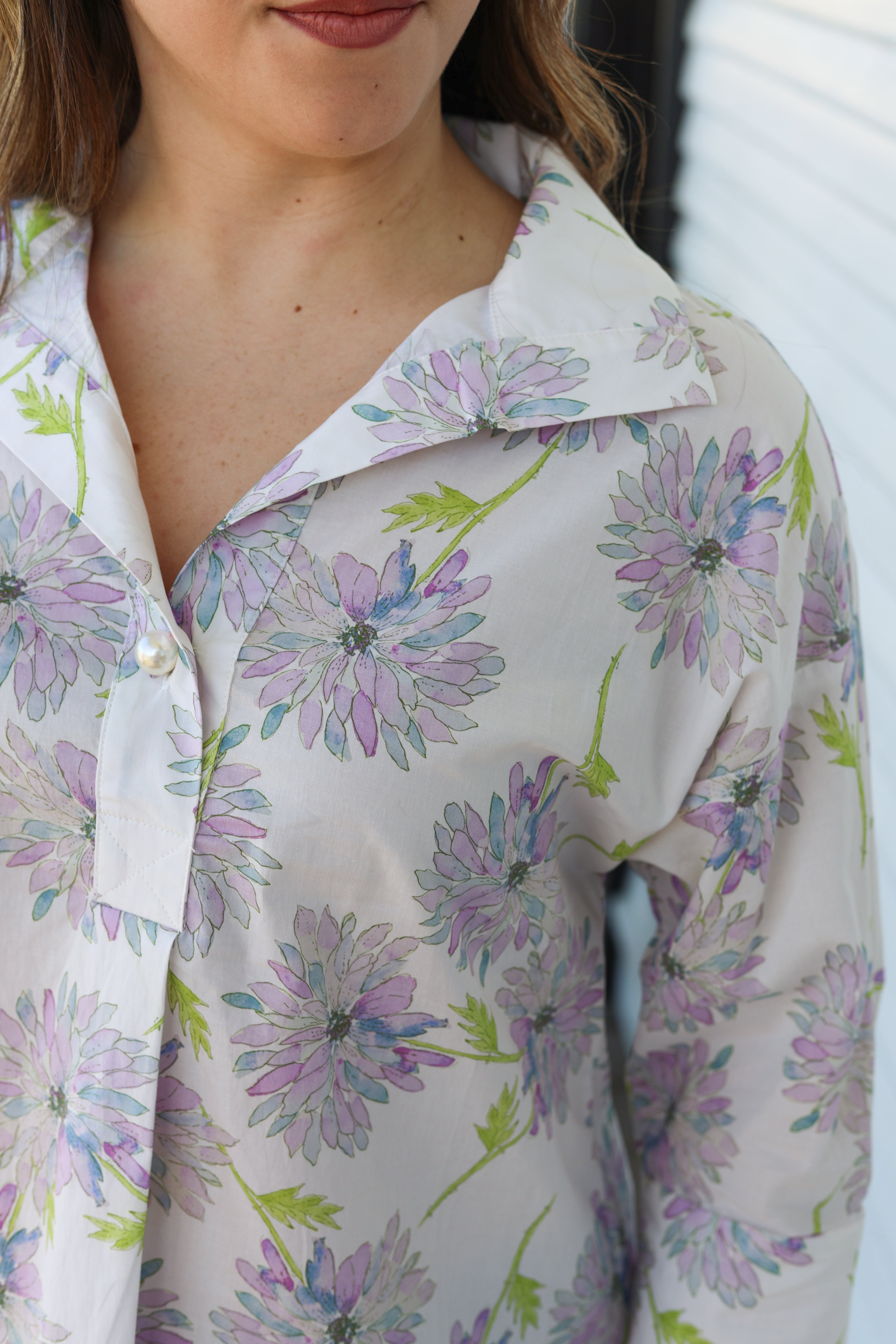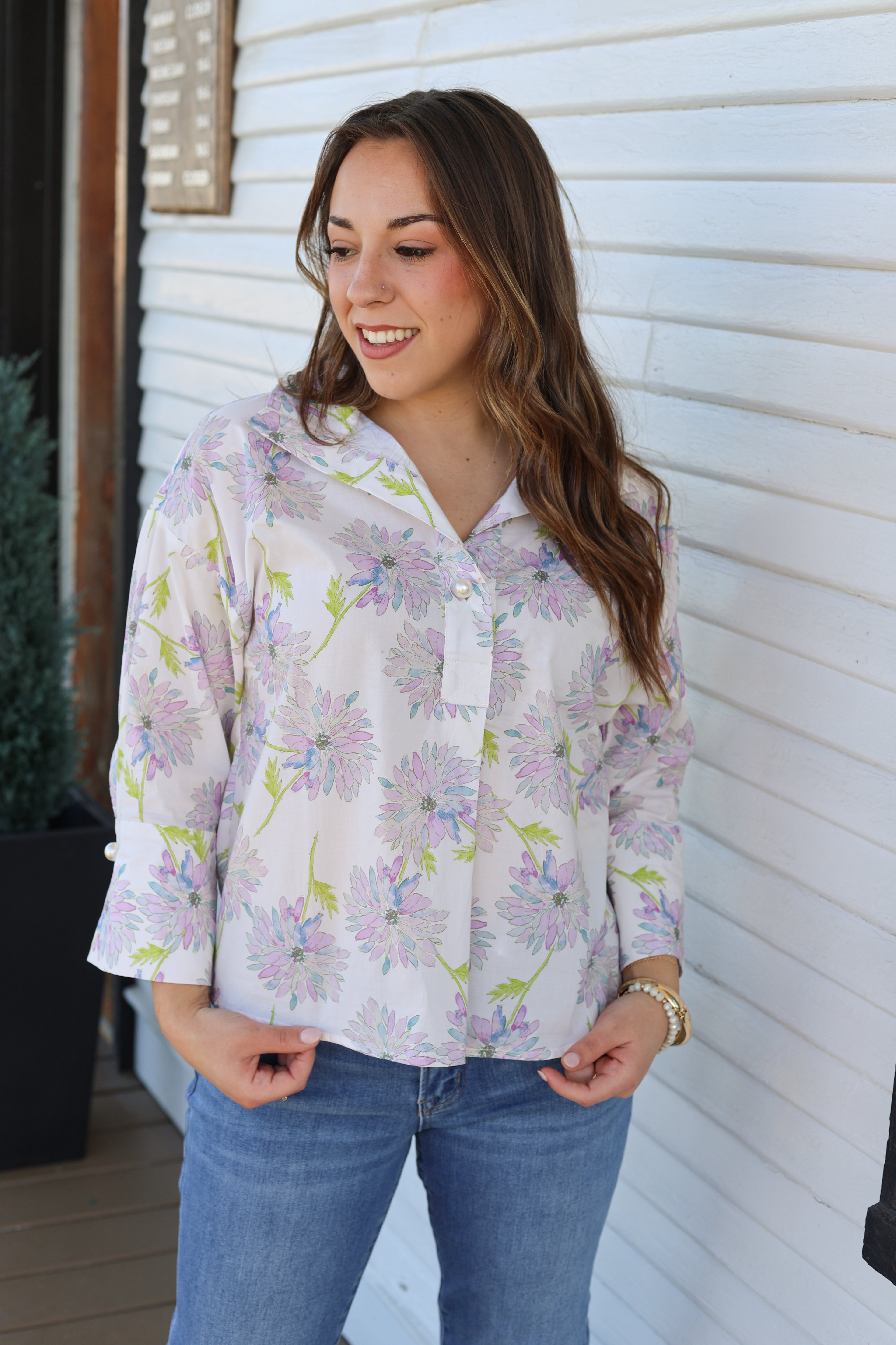 The Lily Blouse brings effortless elegance to your everyday wardrobe. Crafted in crisp white with delicate lavender floral details, this piece strikes the perfect balance between classic and contemporary. Three-quarter length sleeves feature refined pearl button accents that add a touch of sophistication to every wear. Versatile enough for the office, brunch, or weekend outings, the Lily pairs beautifully with tailored pants, denim, or skirts. A timeless staple that elevates any look.