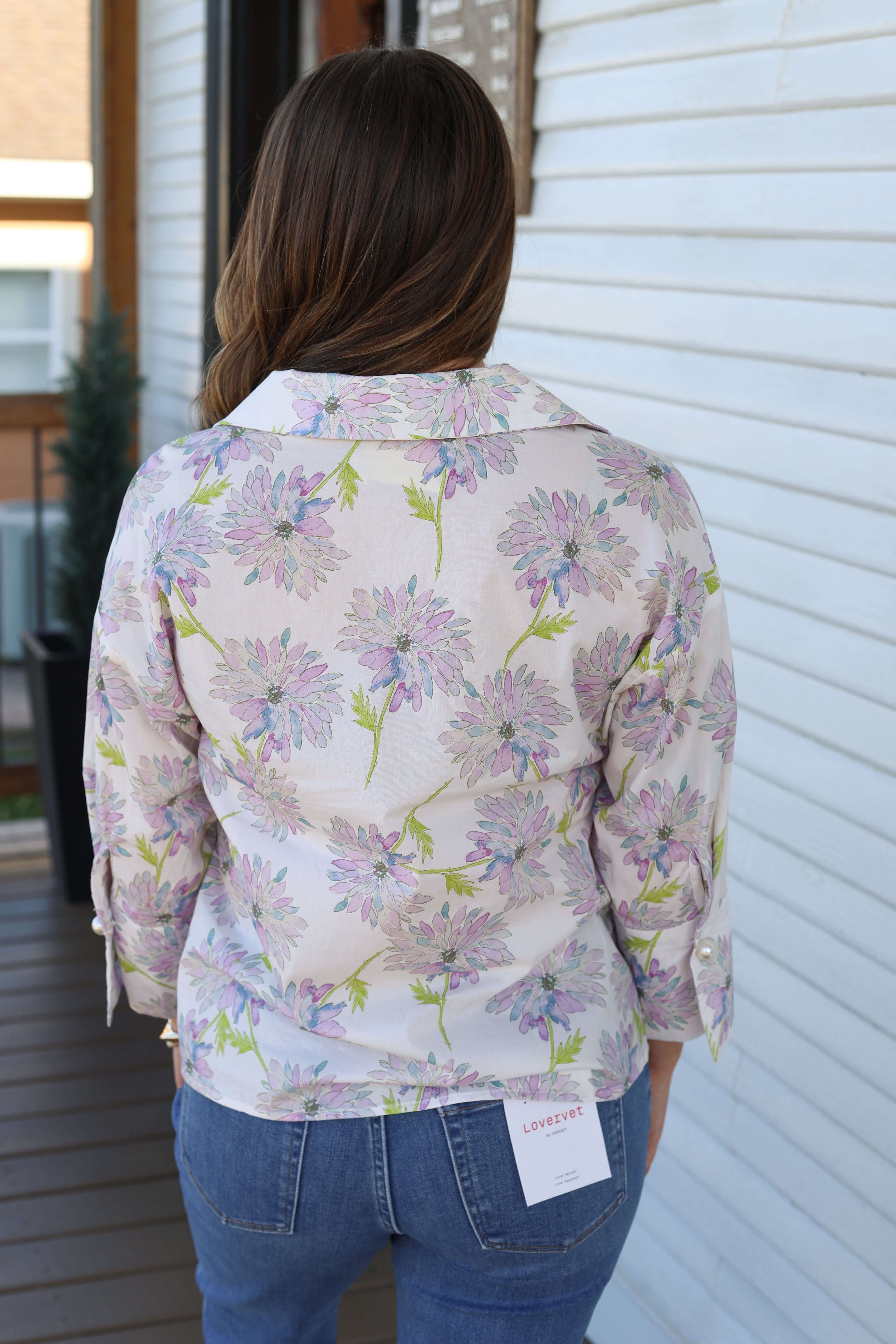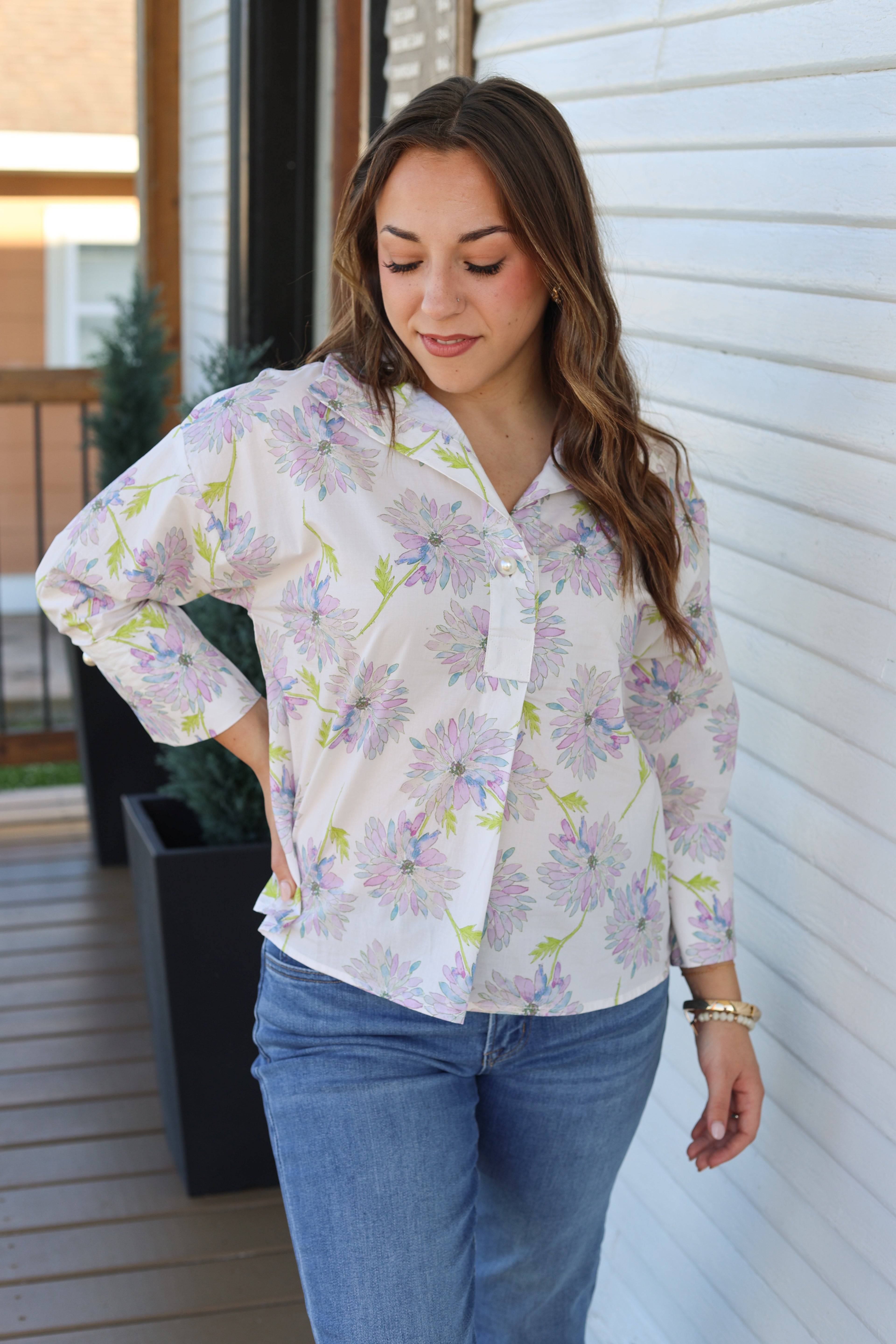Style tip: We LOVE pulling a color from a printed top like this and getting pants in that color to match the top! This would be so cute with lavender denim pants or even a cute green!