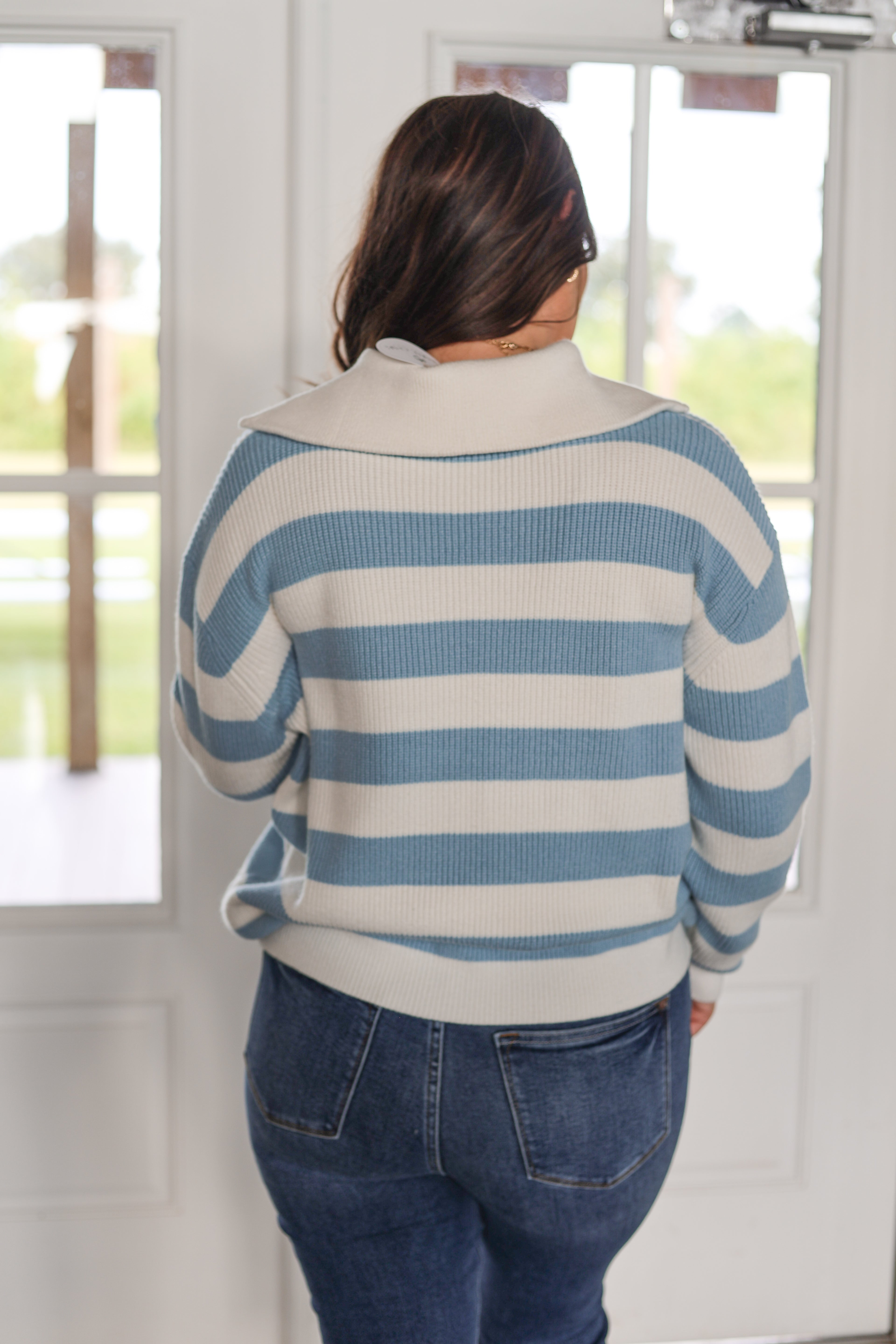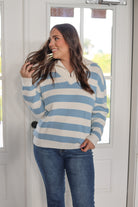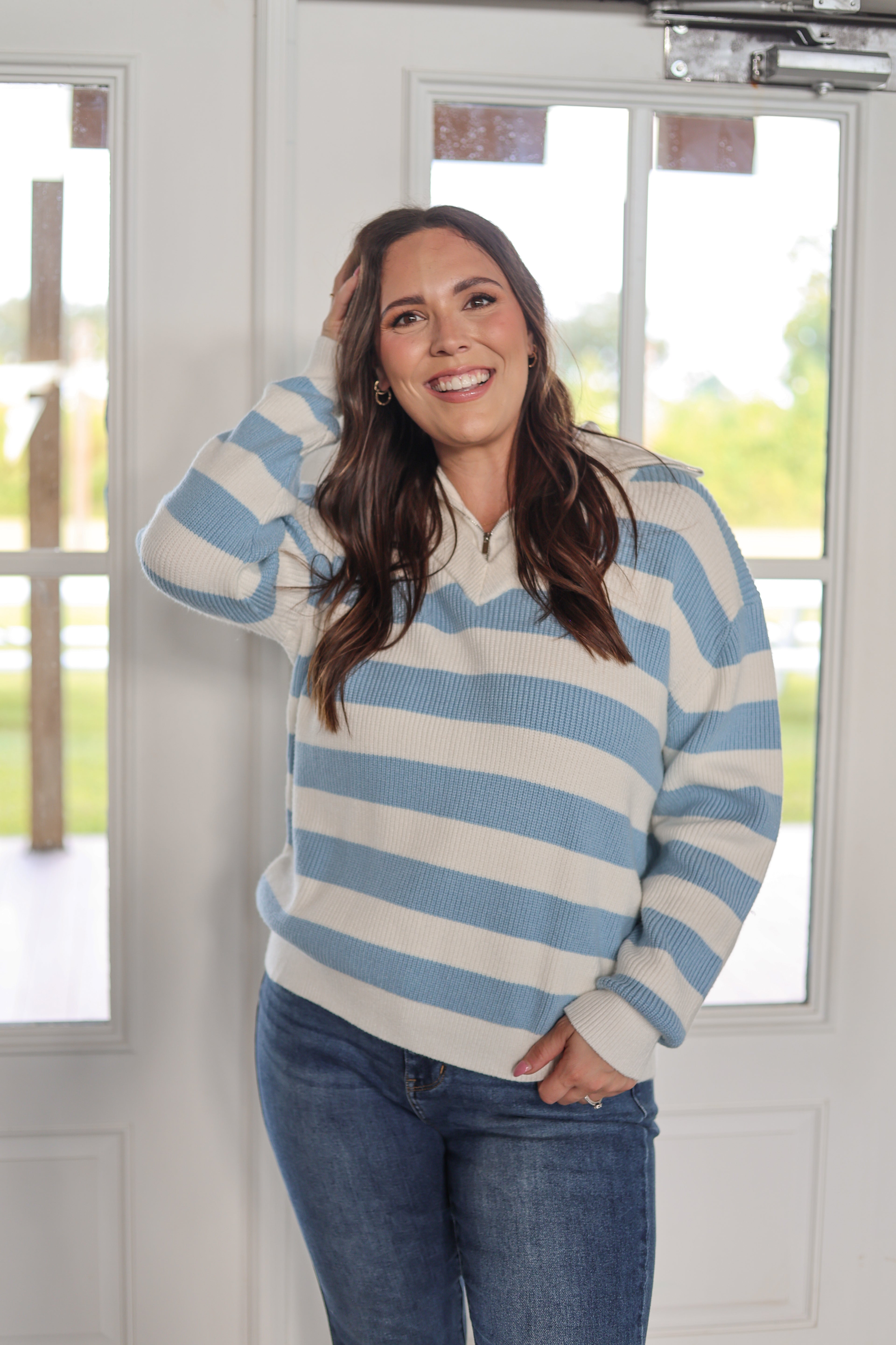 Stay cozy and stylish with the Sherri Sweater! Featuring a charming white and light blue striped pattern, this zip-up mock neck sweater offers a trendy layered look that's perfect for cooler temperatures. Its casual vibe makes it an easy go-to for everyday wear, adding a cute and fresh touch to your fall and winter wardrobe.