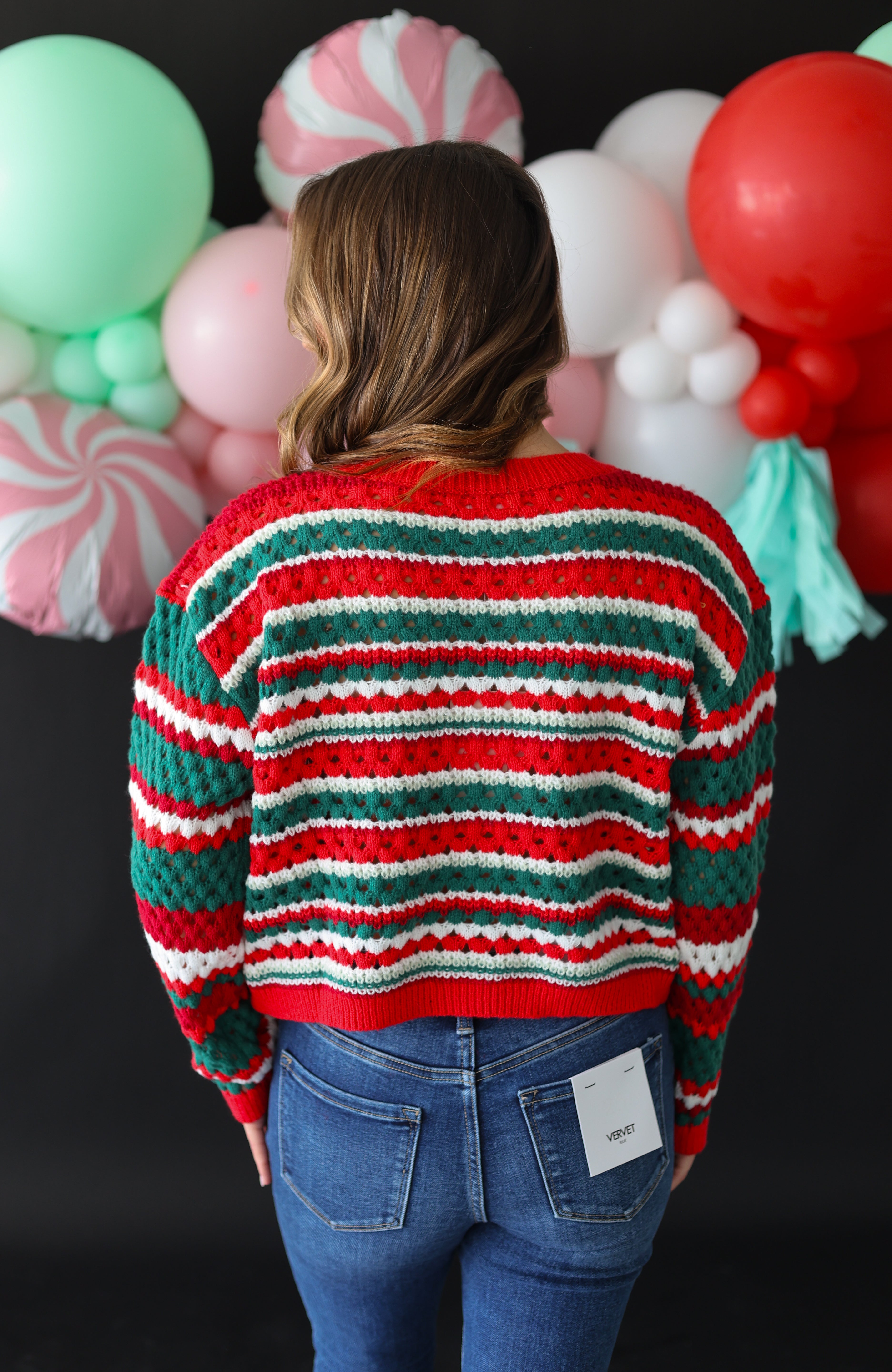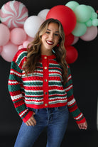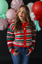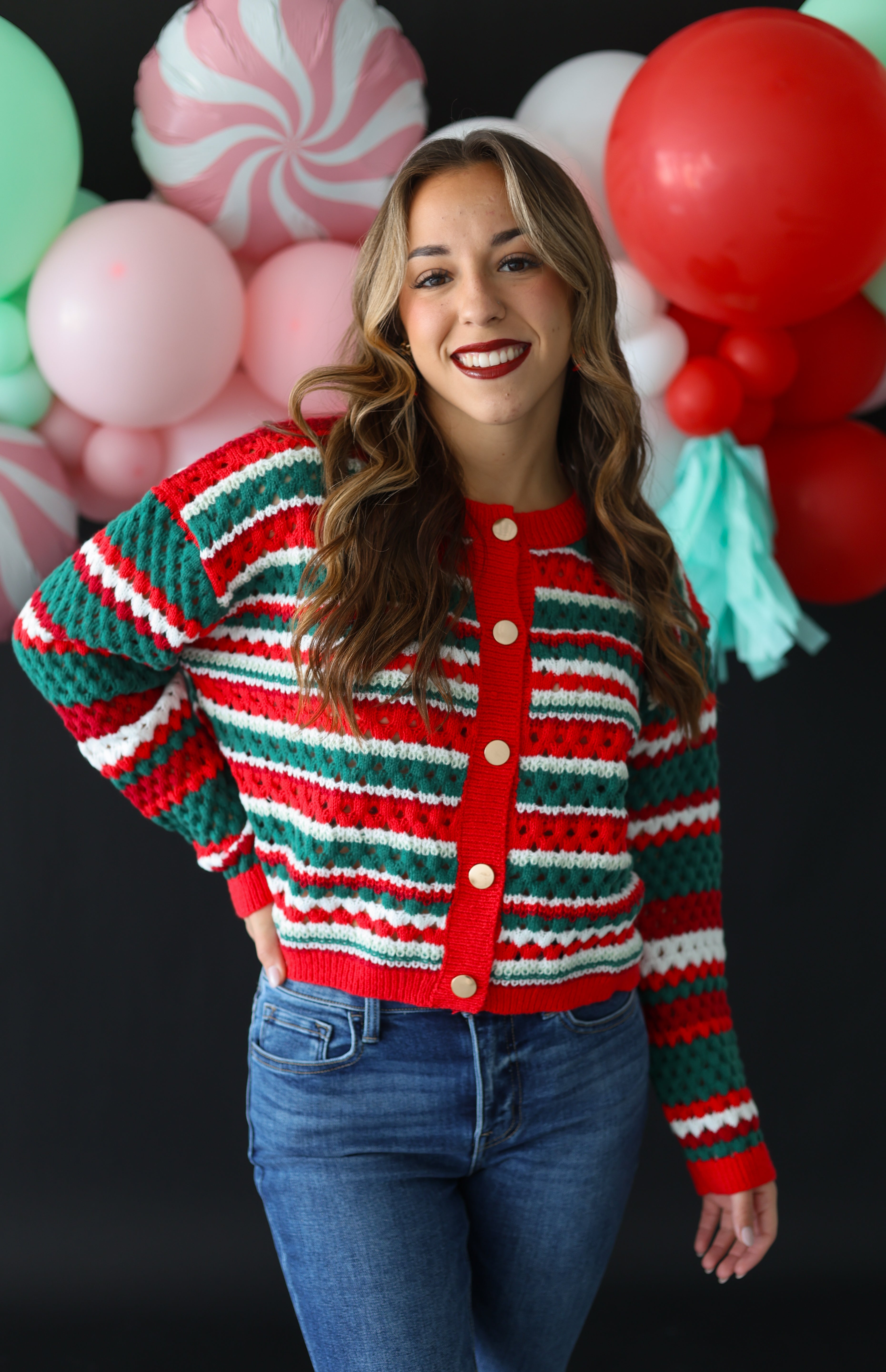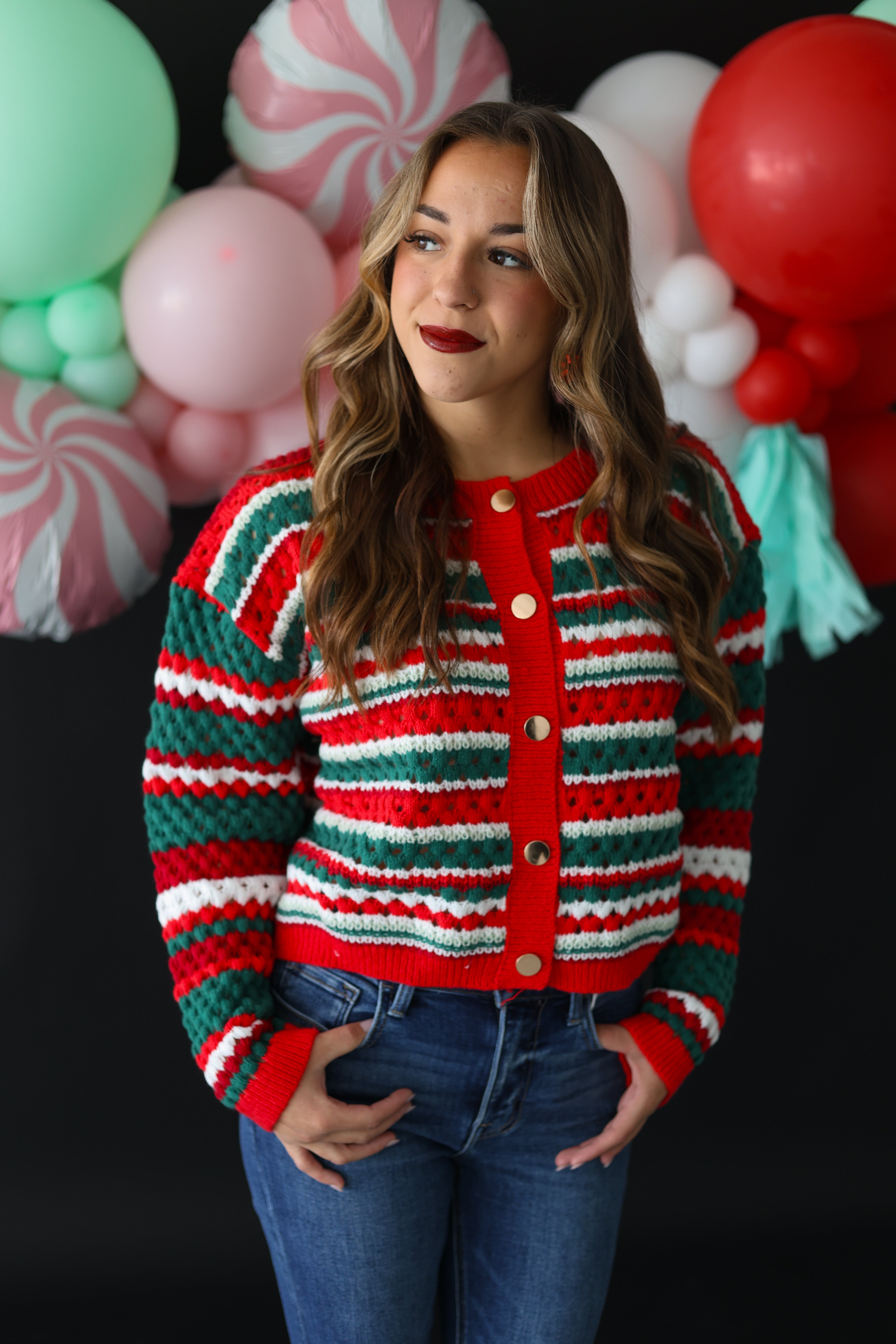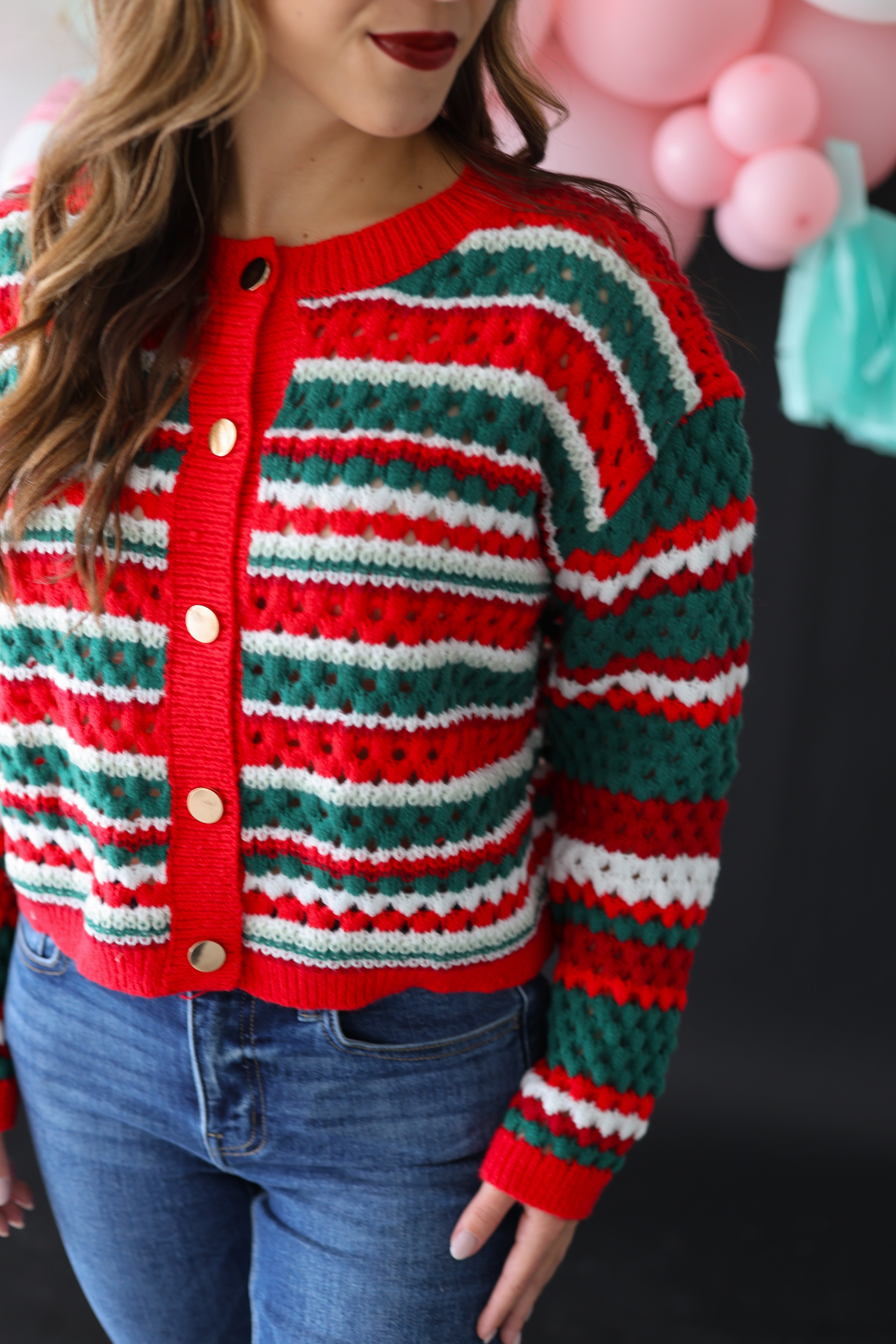 Get into the holiday spirit with the Jingle Babe Cardigan! This cozy striped textured cardigan is perfect for festive days, featuring eye-catching gold buttons that add a touch of sparkle. Whether you're wrapping gifts or enjoying a winter walk, it brings warmth and style to every holiday moment. This is a “holy” cardigan, Tana is wearing a nude bra beneath but you can wear a tank for more coverage!