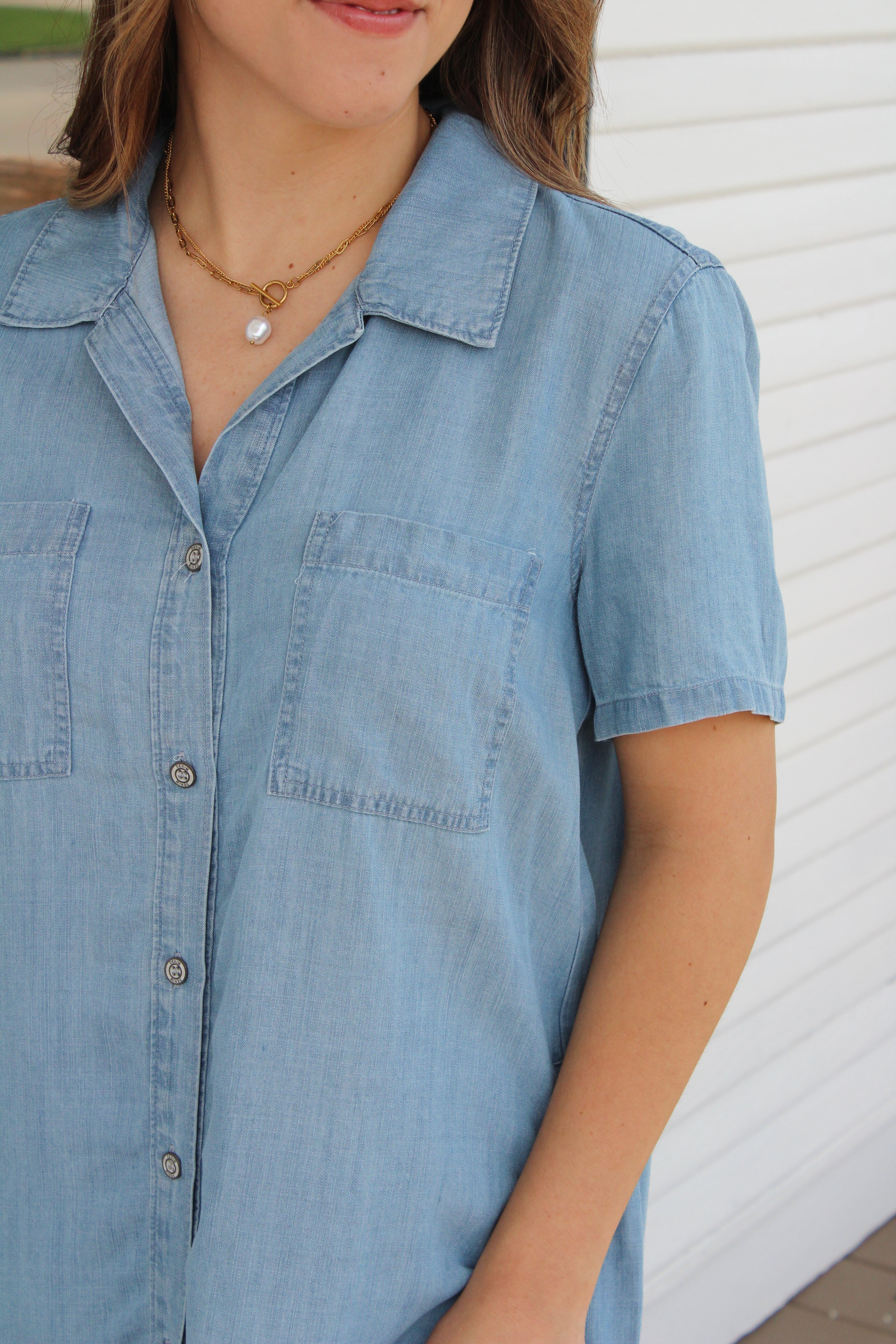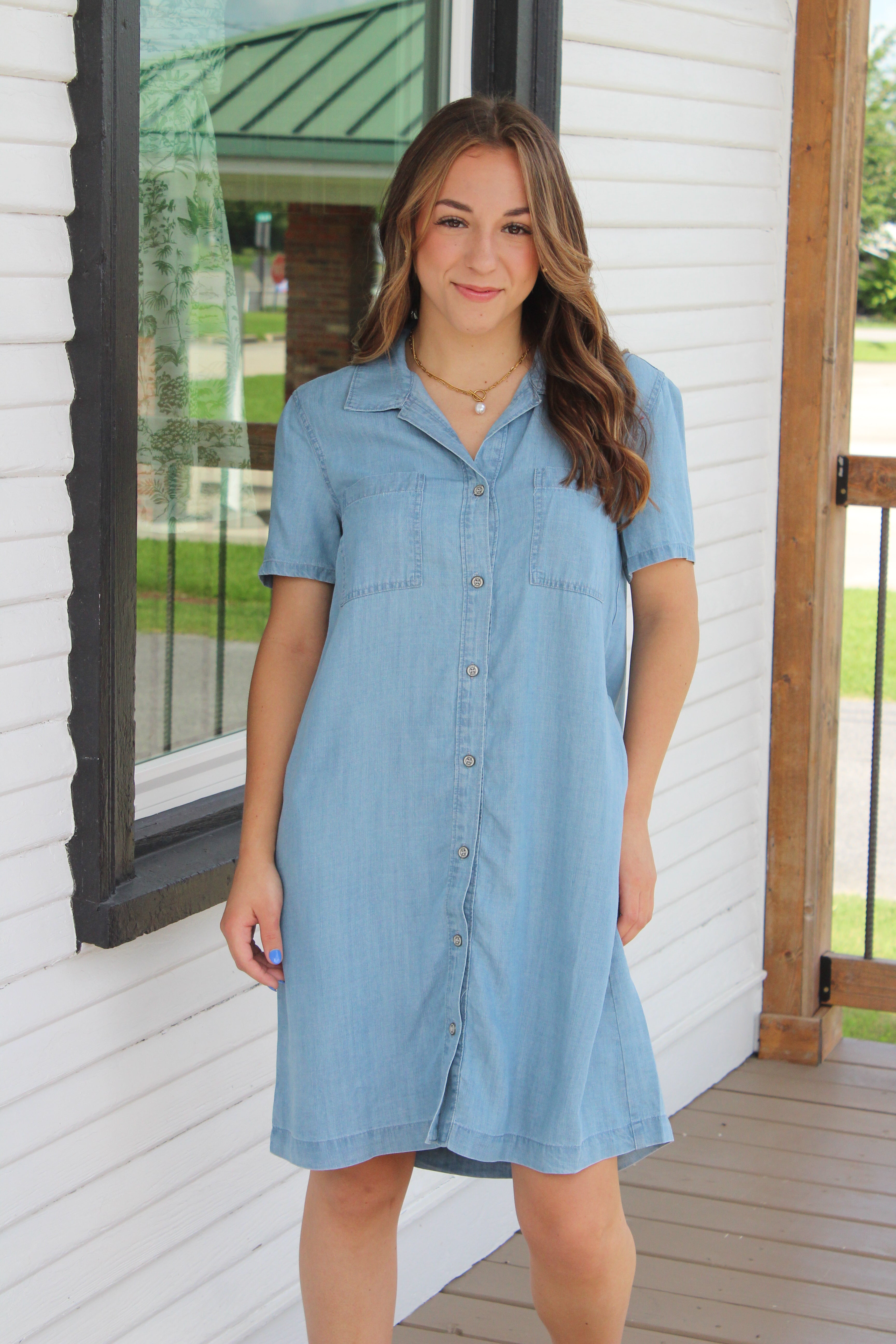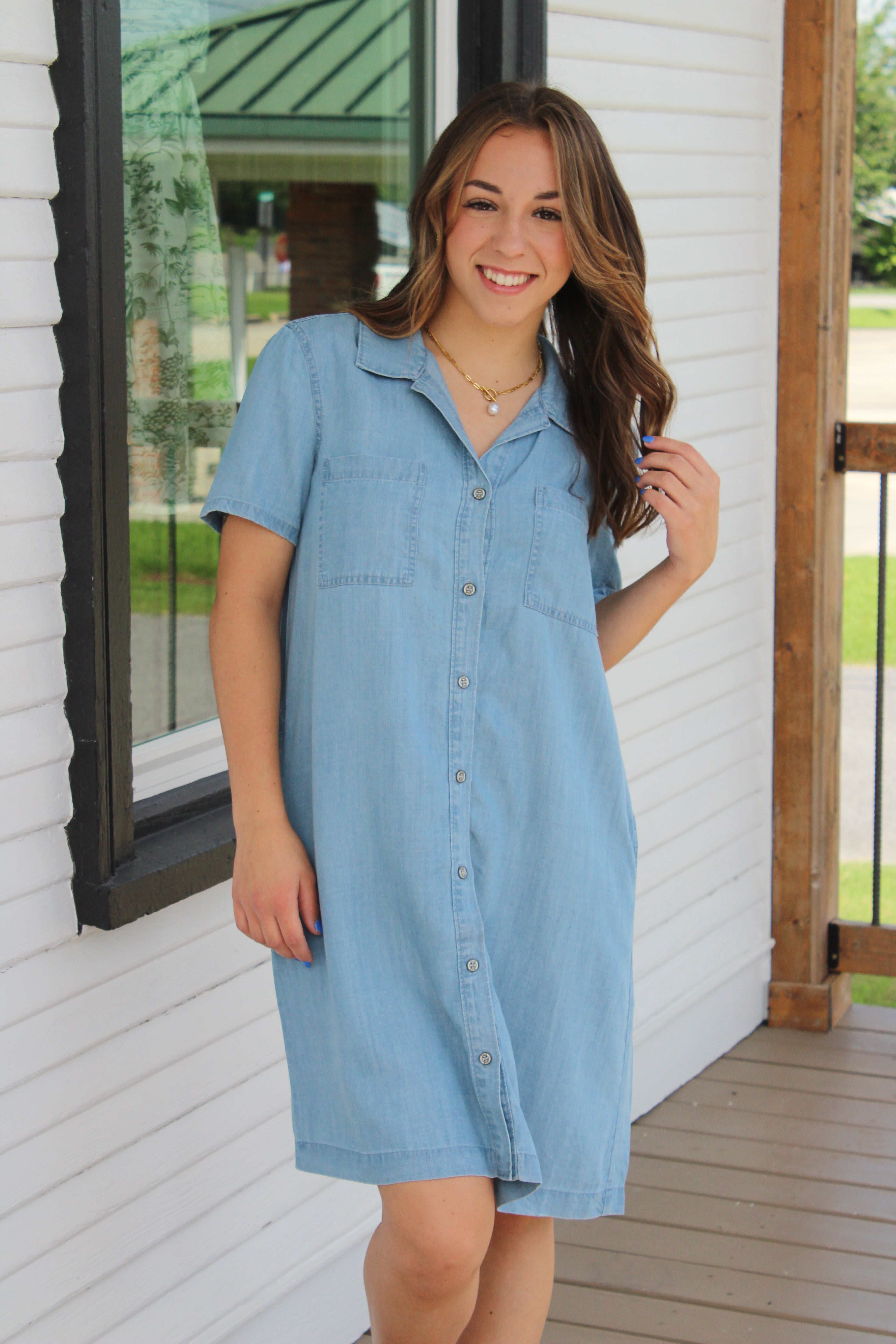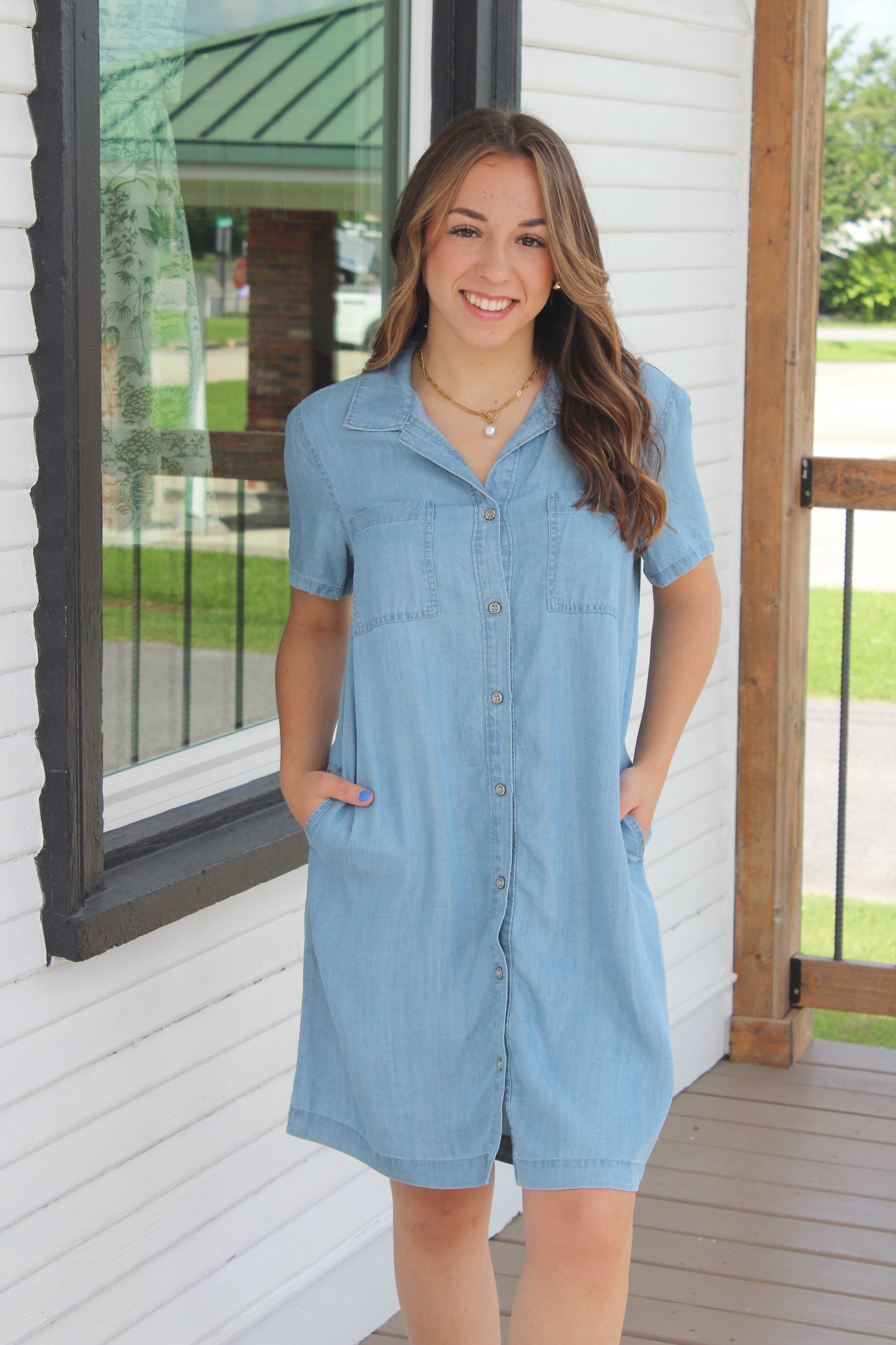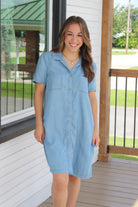The Kaye Tencel Dress combines the classic appeal of denim with the soft, breathable feel of Tencel fabric. Featuring a button-up front, a neat collar, and handy pockets, this knee-length dress is perfect for both workdays and casual outings. Its versatile design makes it an easy go-to for everyday wear, blending comfort and style effortlessly.