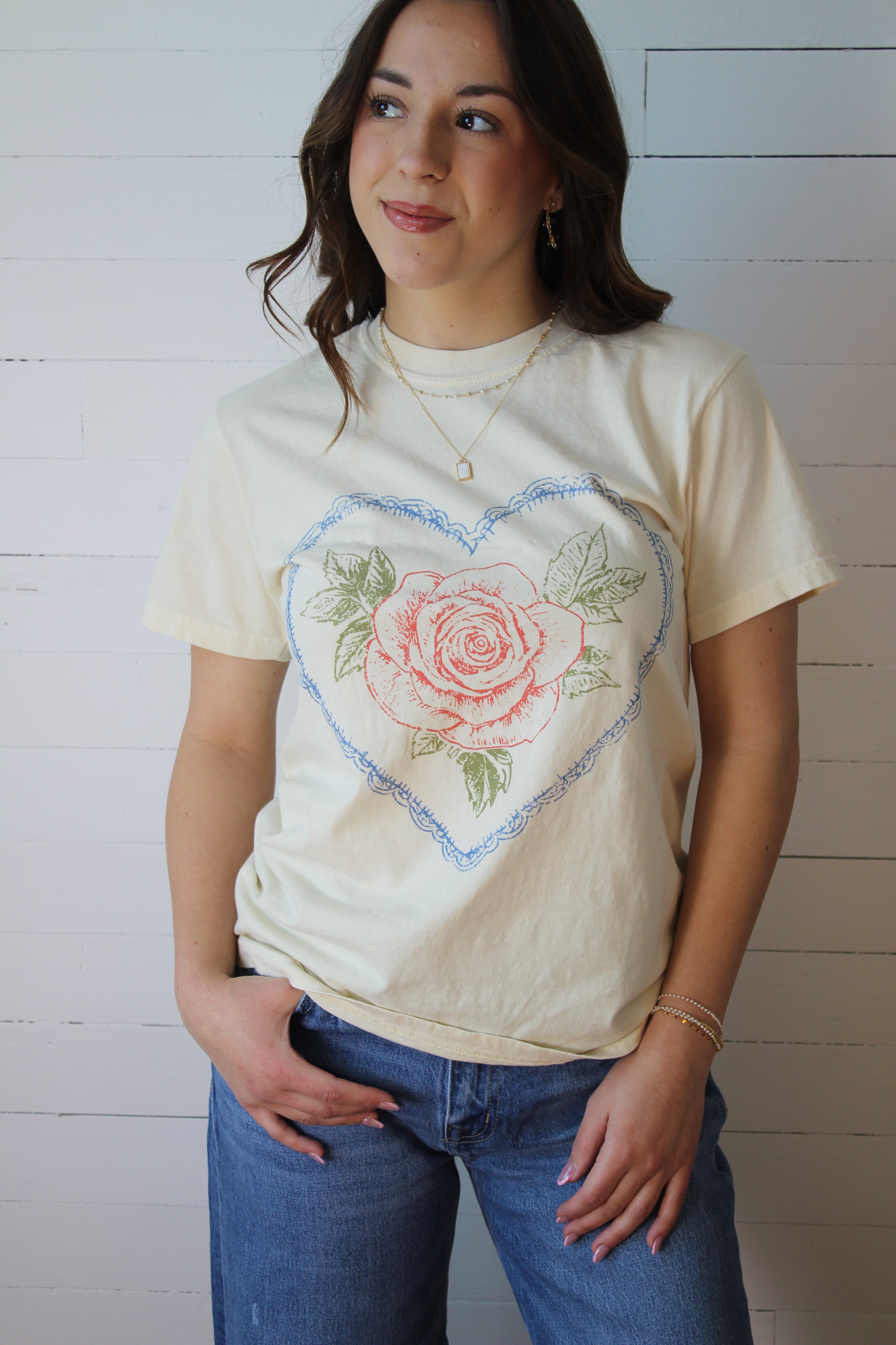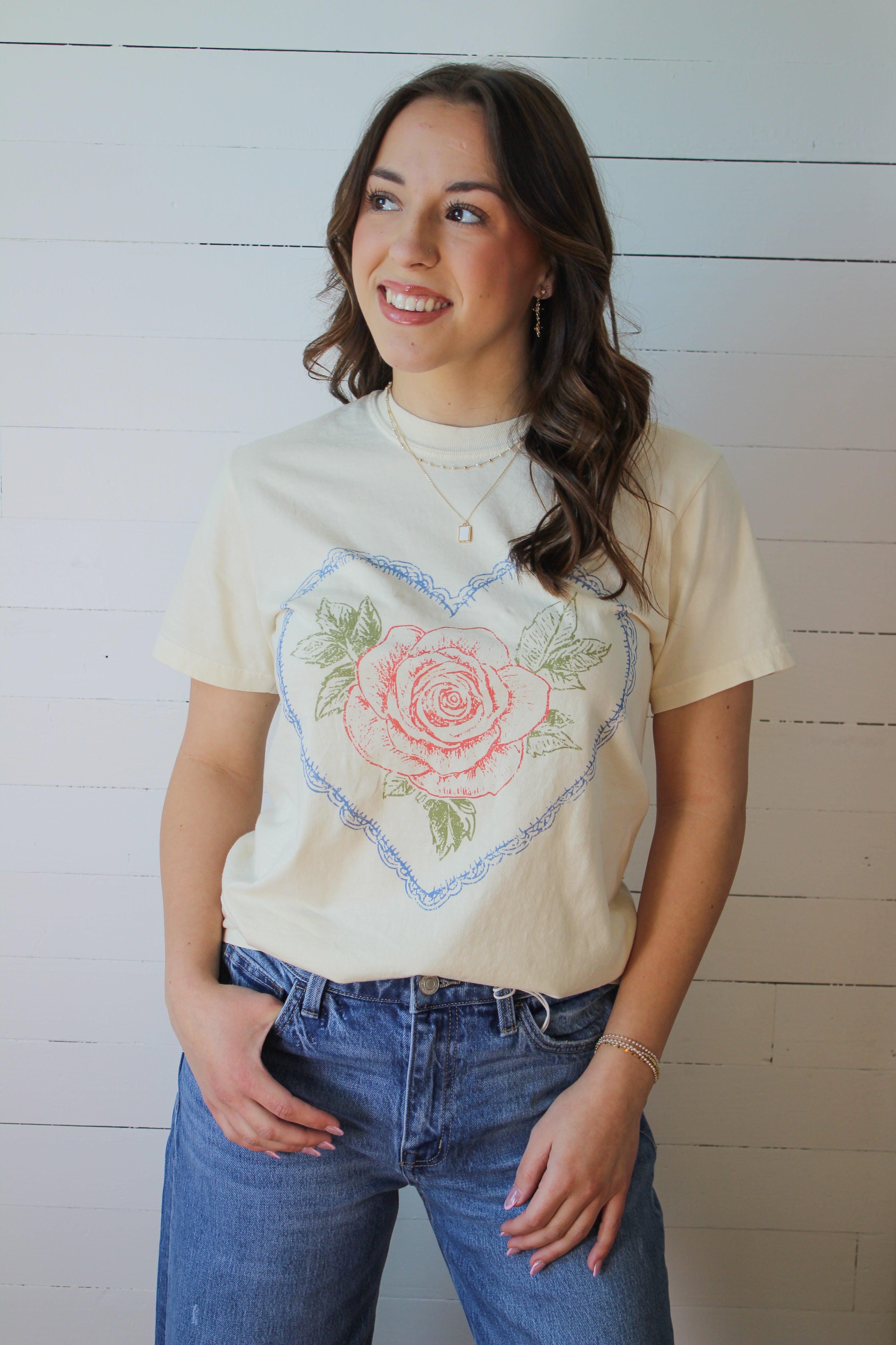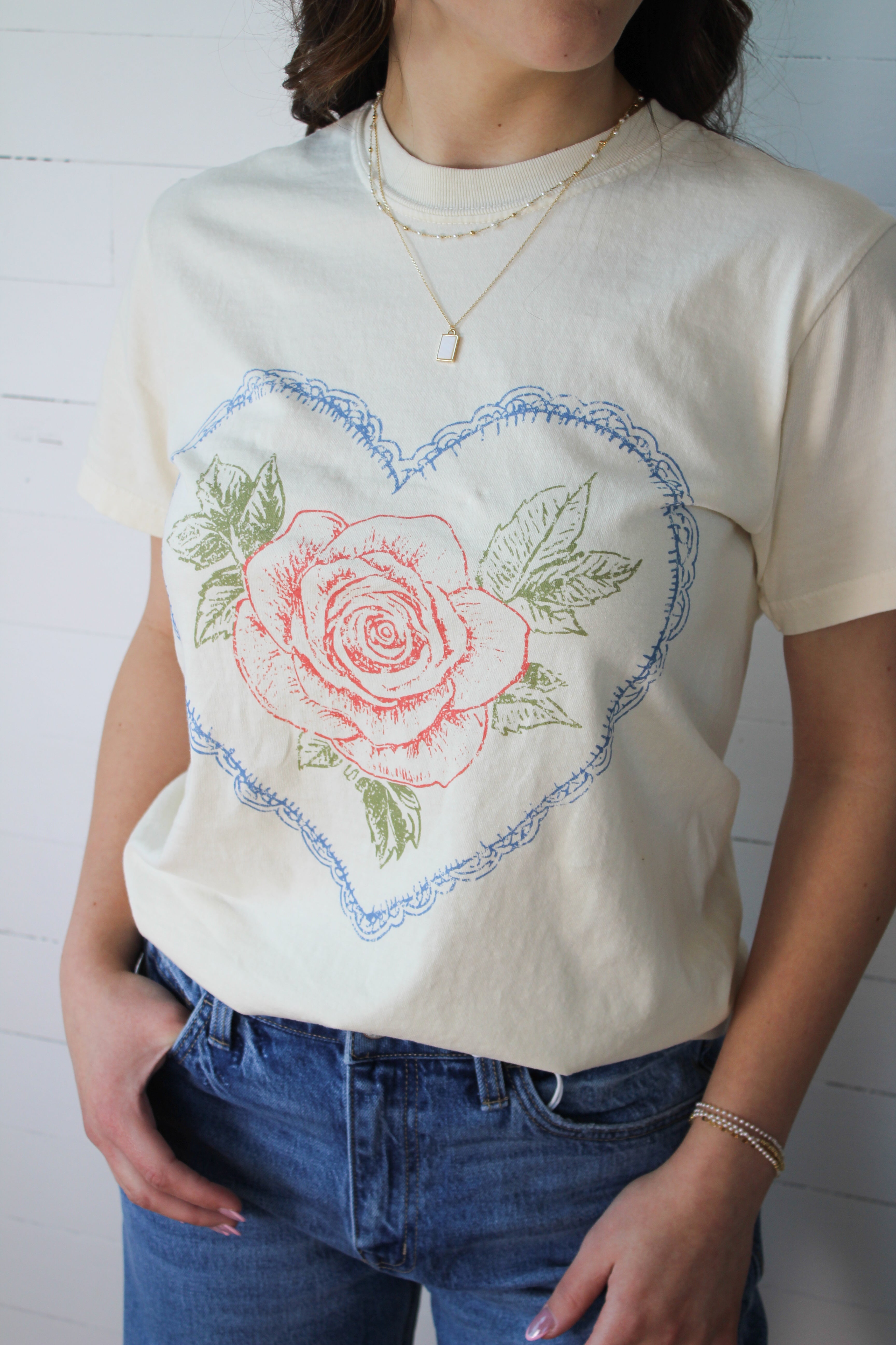 Fall in love with our Lace Heart Tee! This delicate ivory tee features a stunning lace heart and rose graphic design that adds a touch of romance to any outfit. A must-have staple for any wardrobe, this tee is sure to become your new favorite.