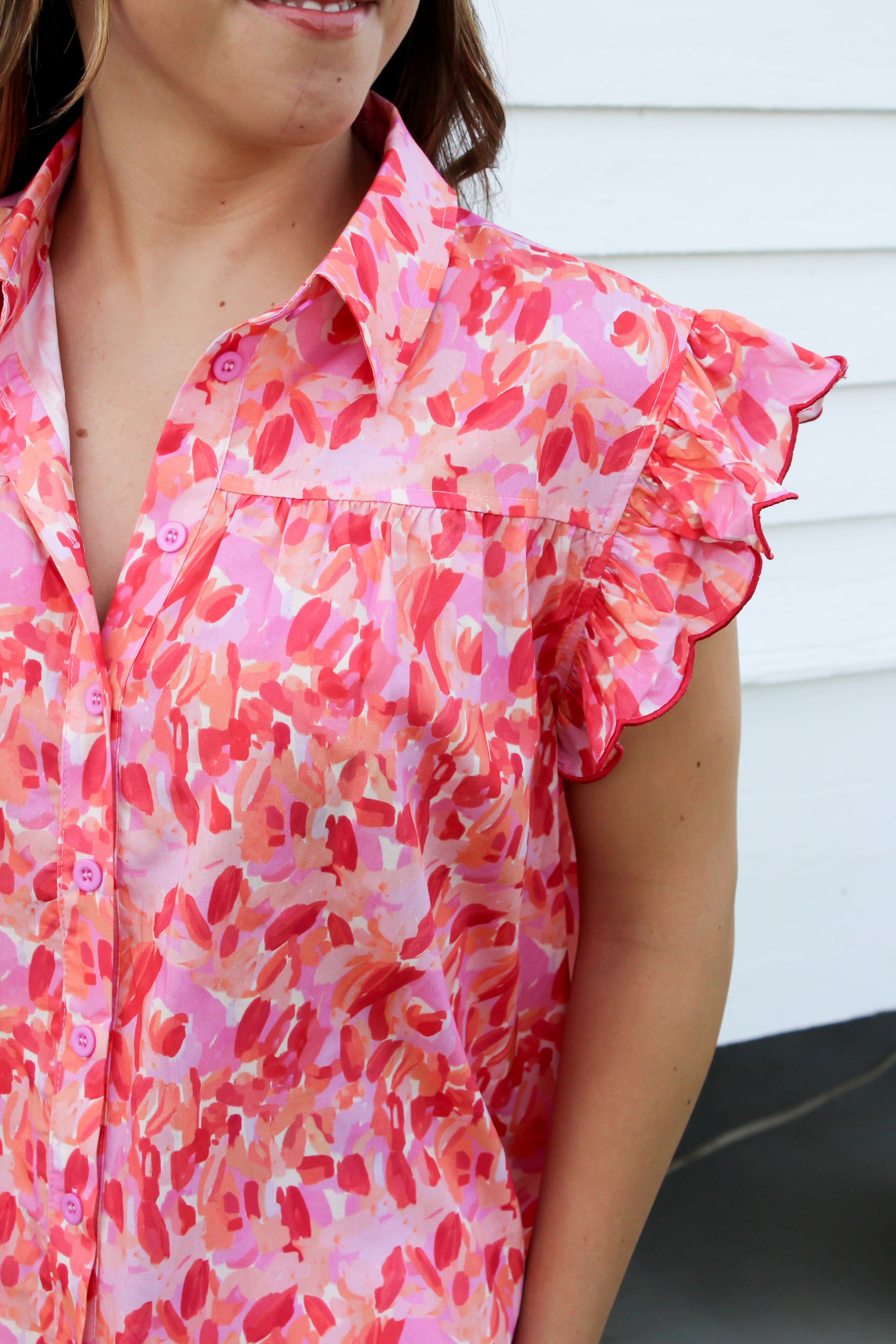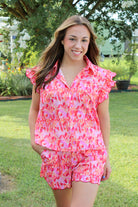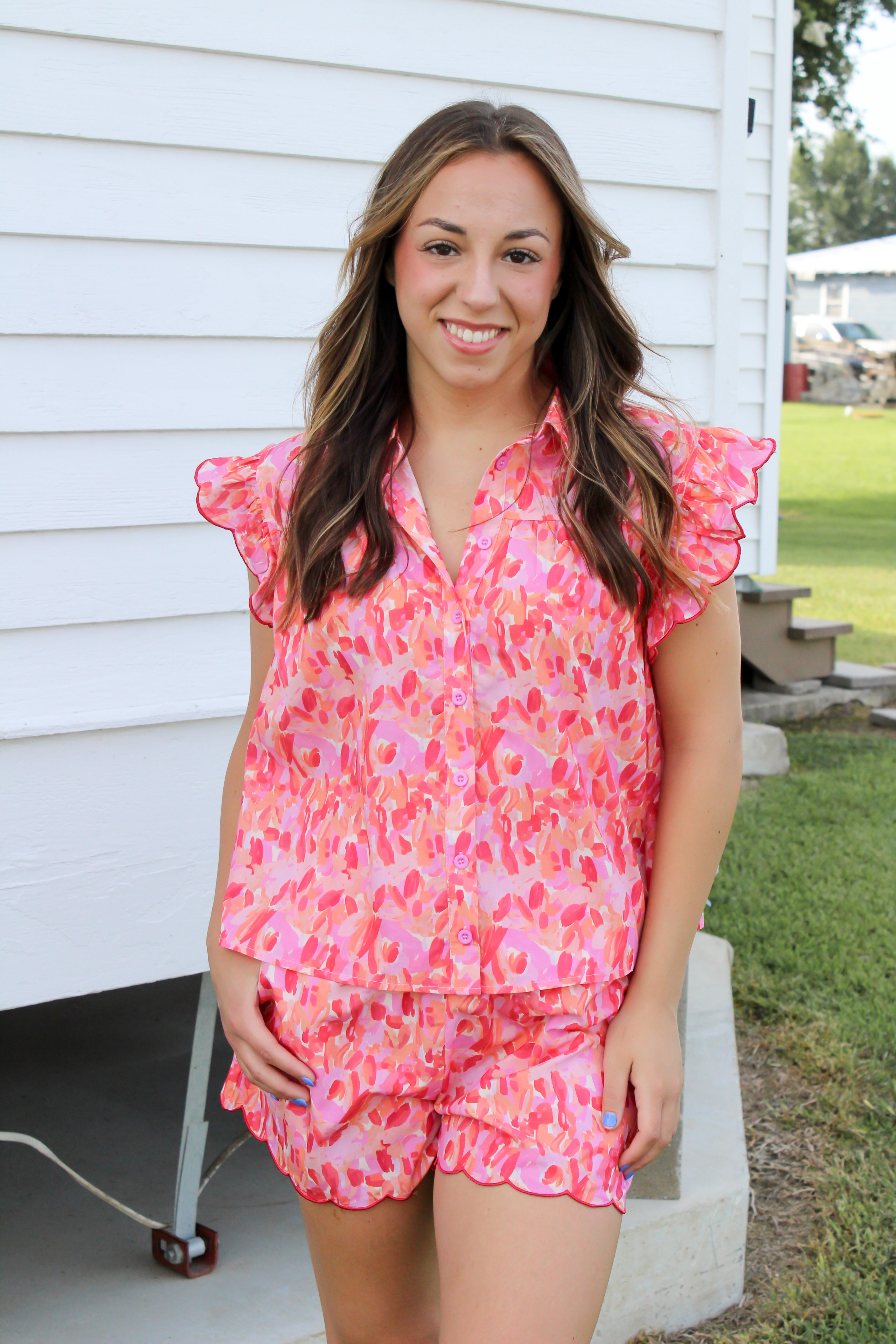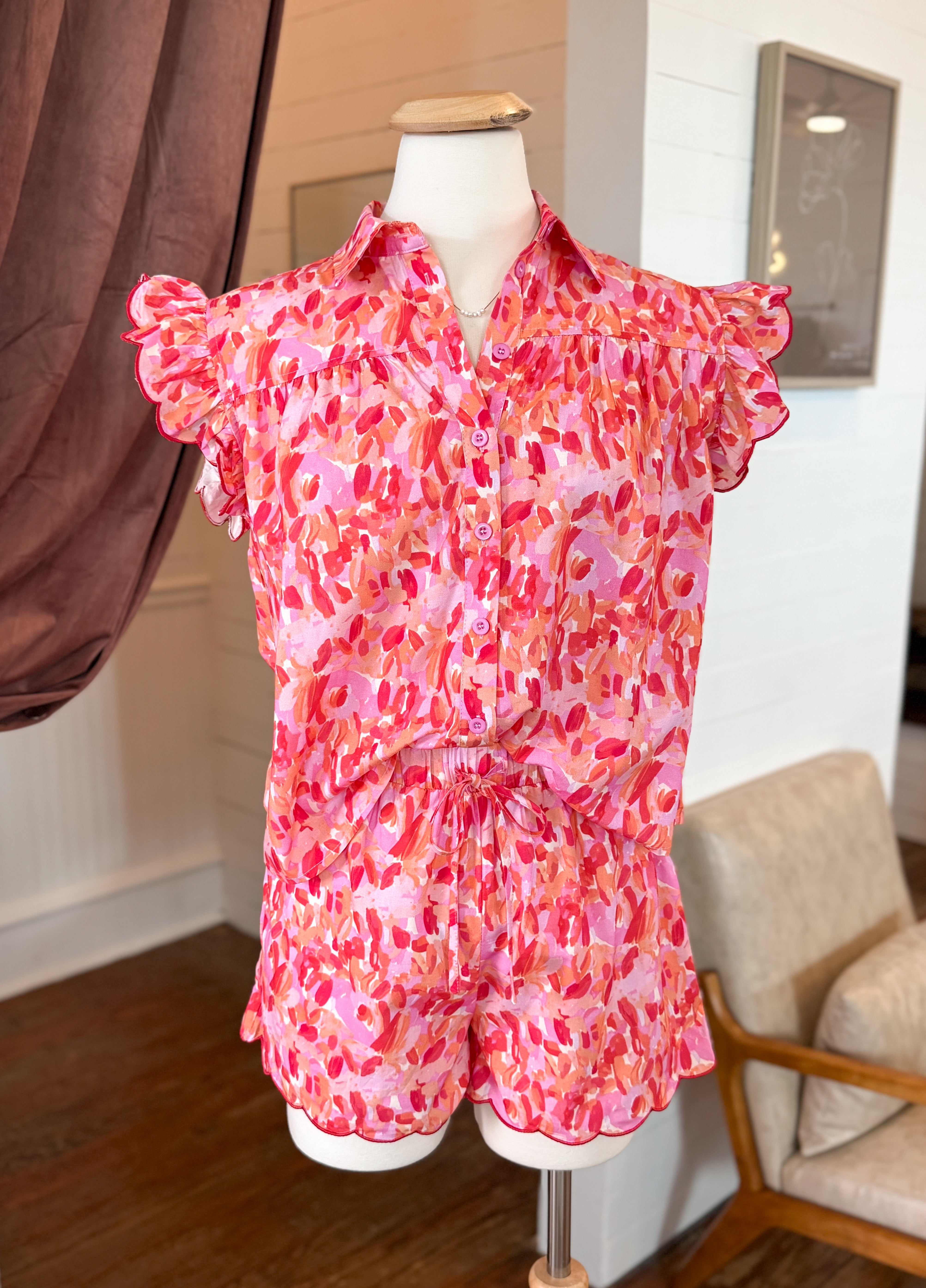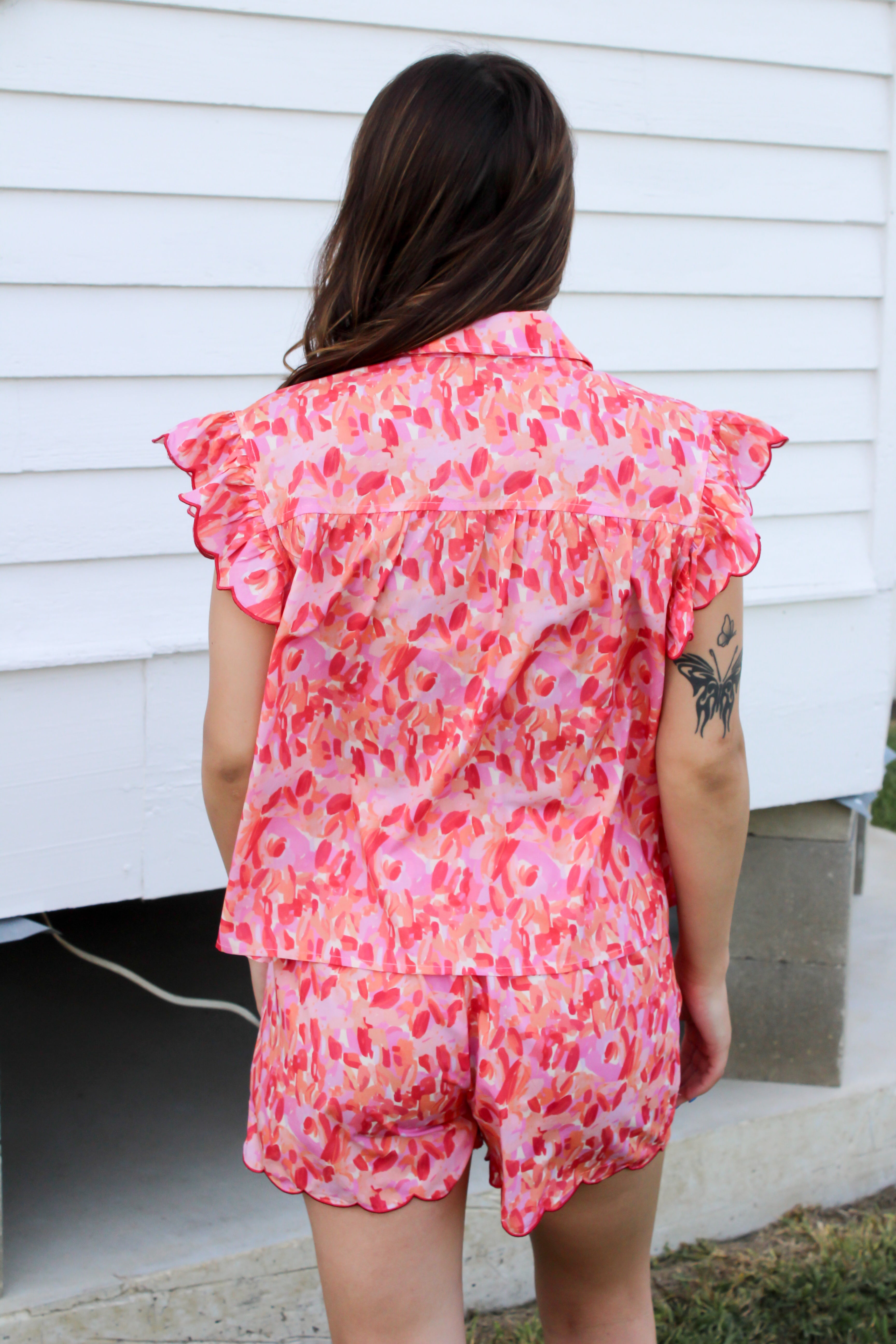 Indulge in the vibrant energy of summer with our Summer Lovin' Set! Featuring a red, pink, and orange abstract print, this two piece set is perfect for adding a pop of color to your summer wardrobe. With delicate scalloped trim and a button down design, this set is both stylish and comfortable for all your summer adventures. Get ready to have some fun in the sun!