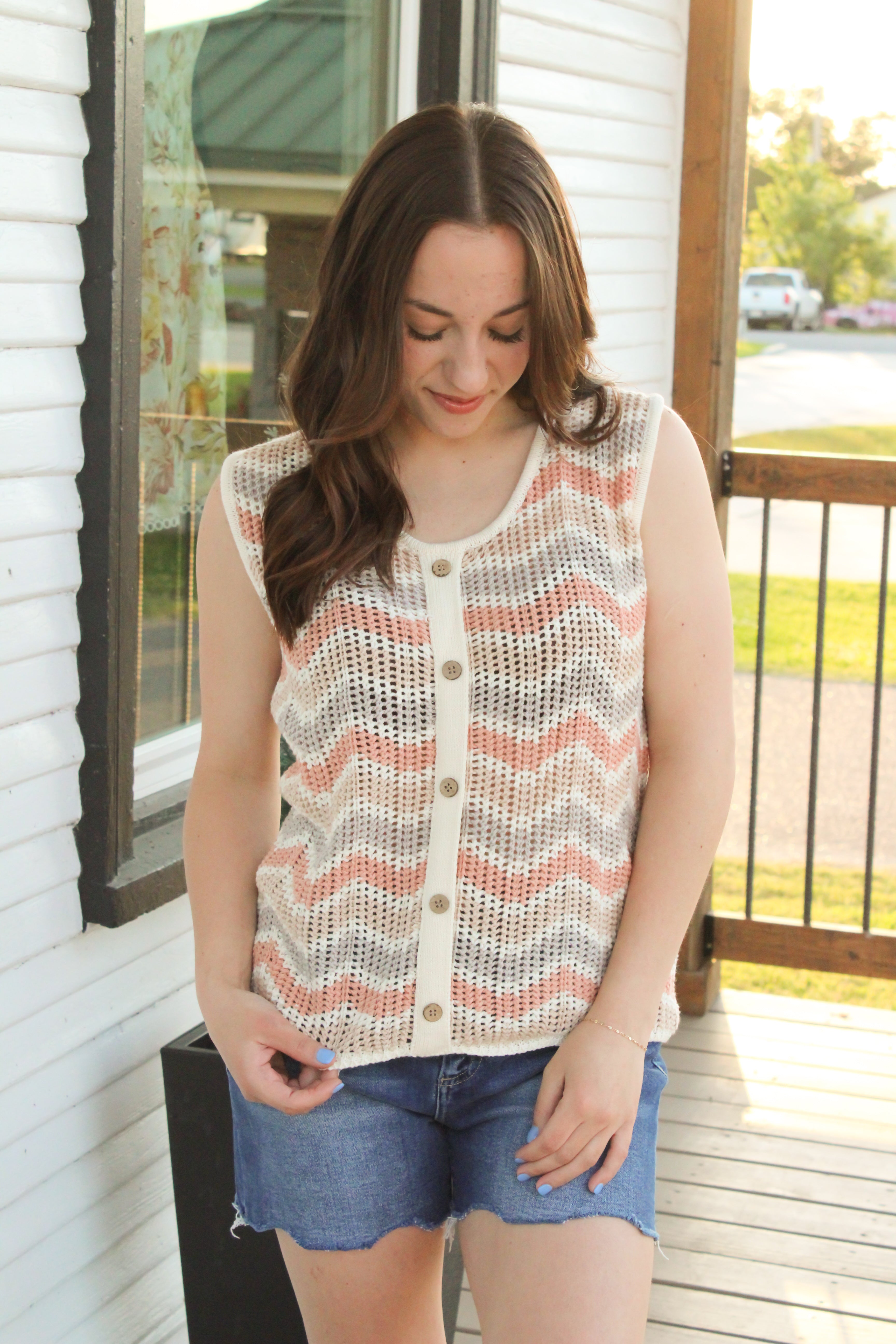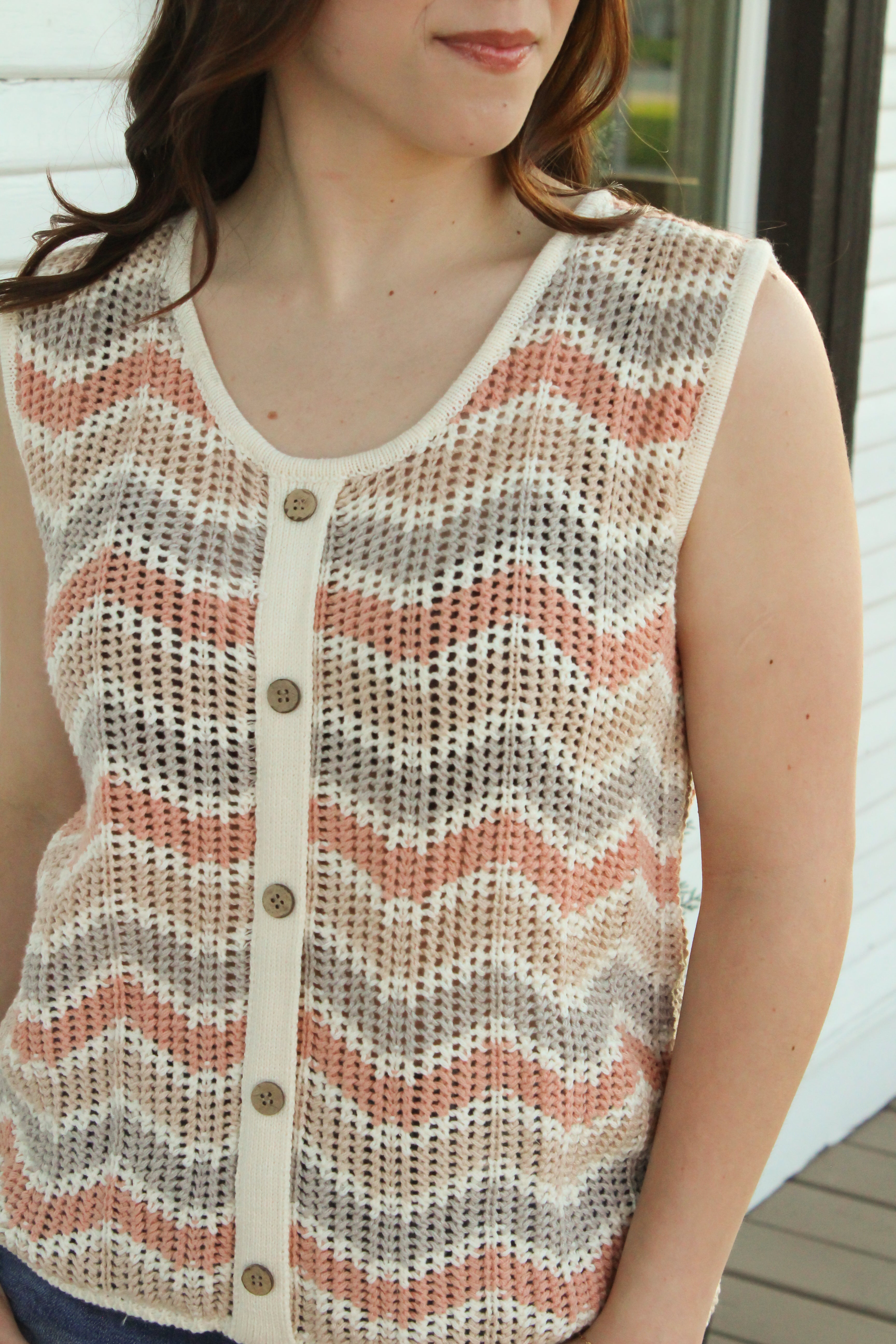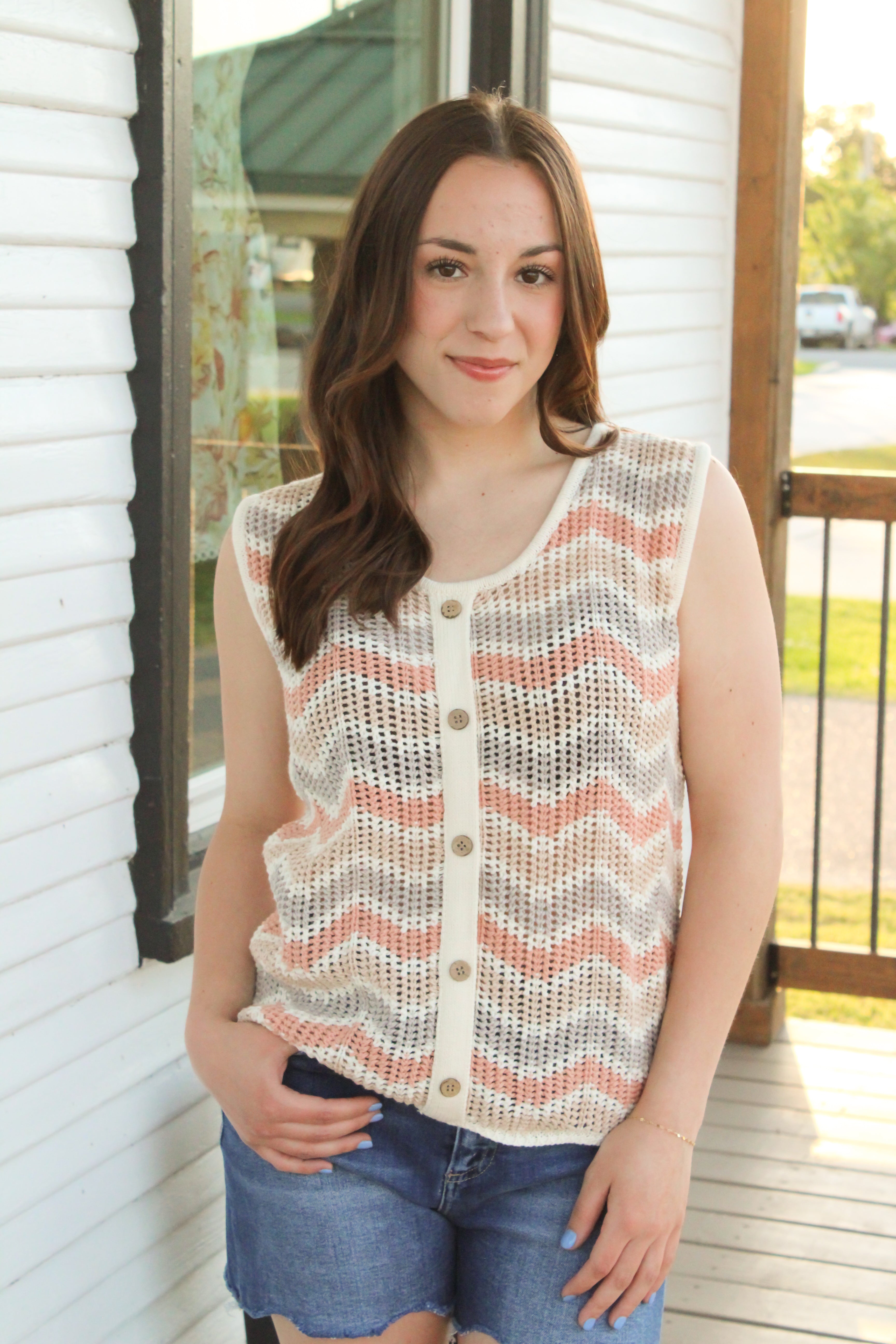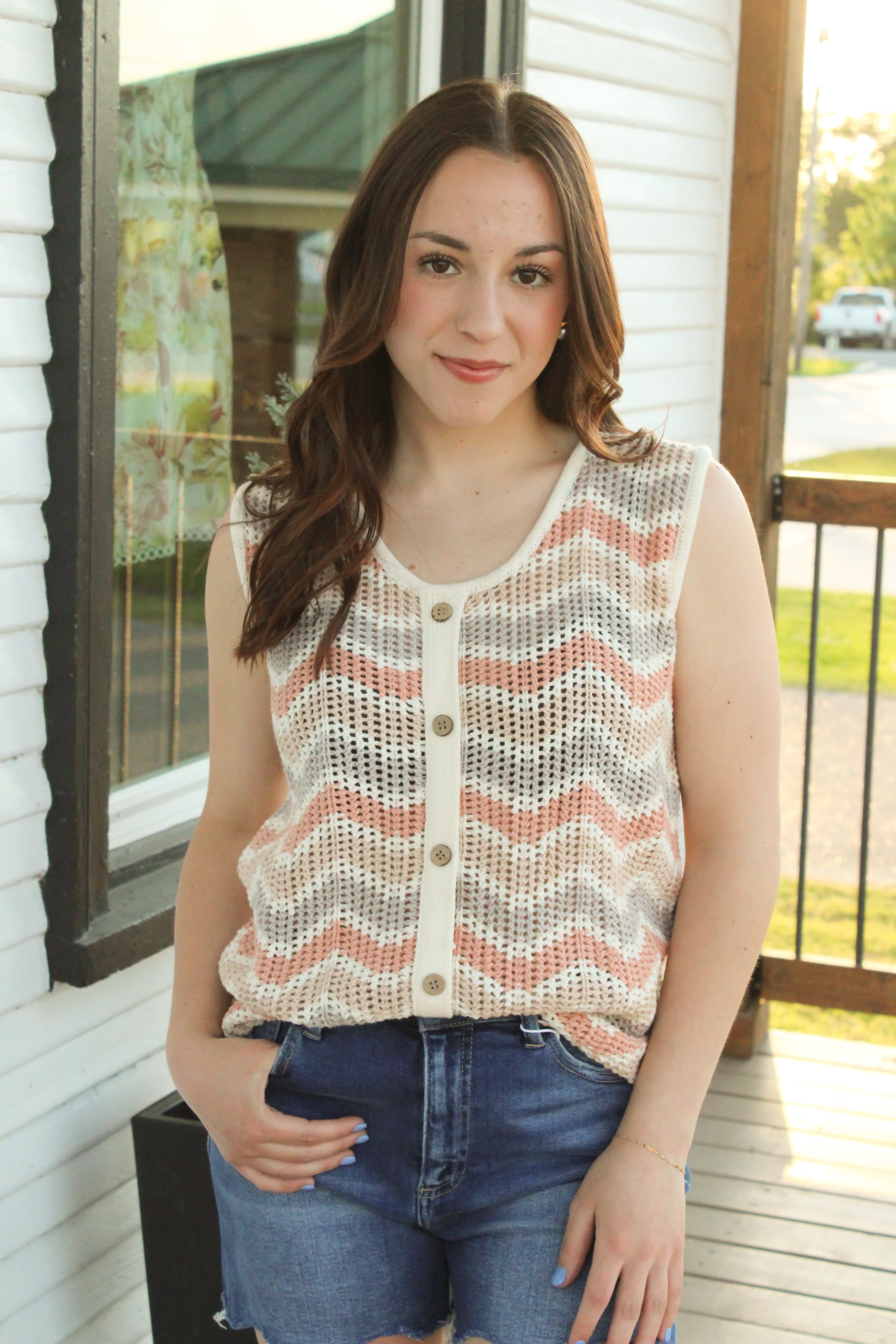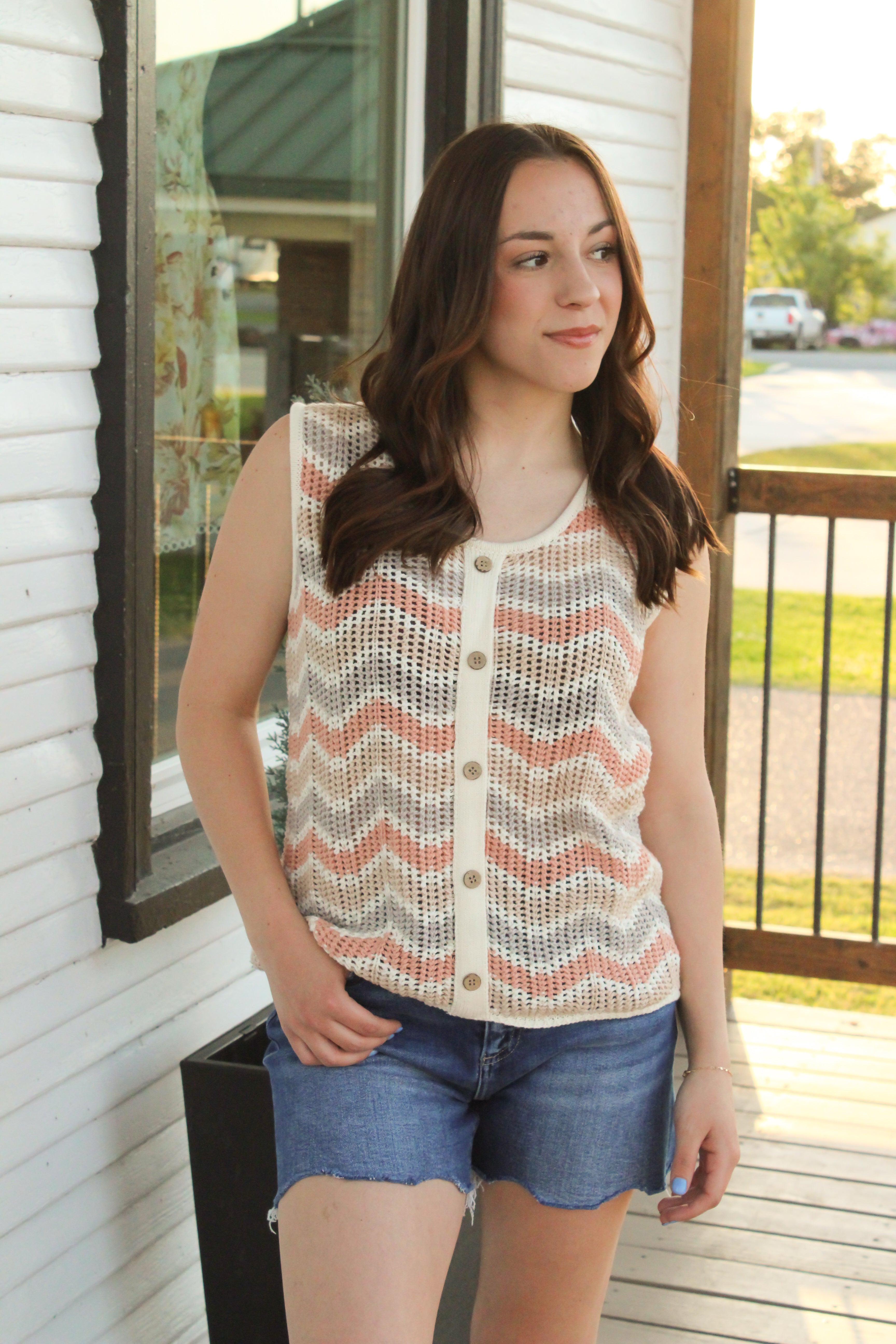 Introducing the Zig Zag Crochet Top - the perfect summer/spring top! The vibrant, zig zag crochet design adds a fun pop of color, while the faux button down detail adds a touch of charm. Pair with denim shorts for a cute and casual look.