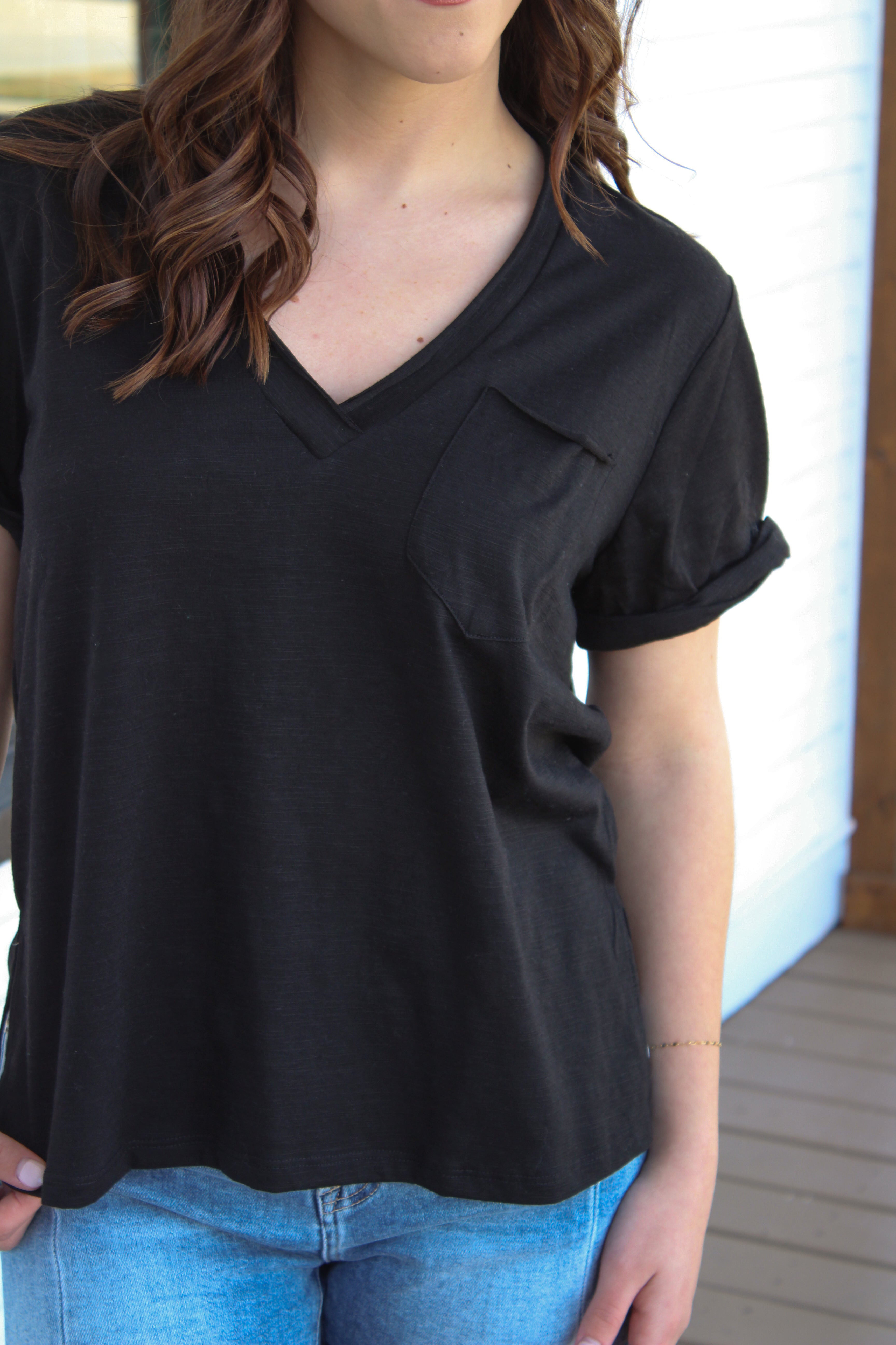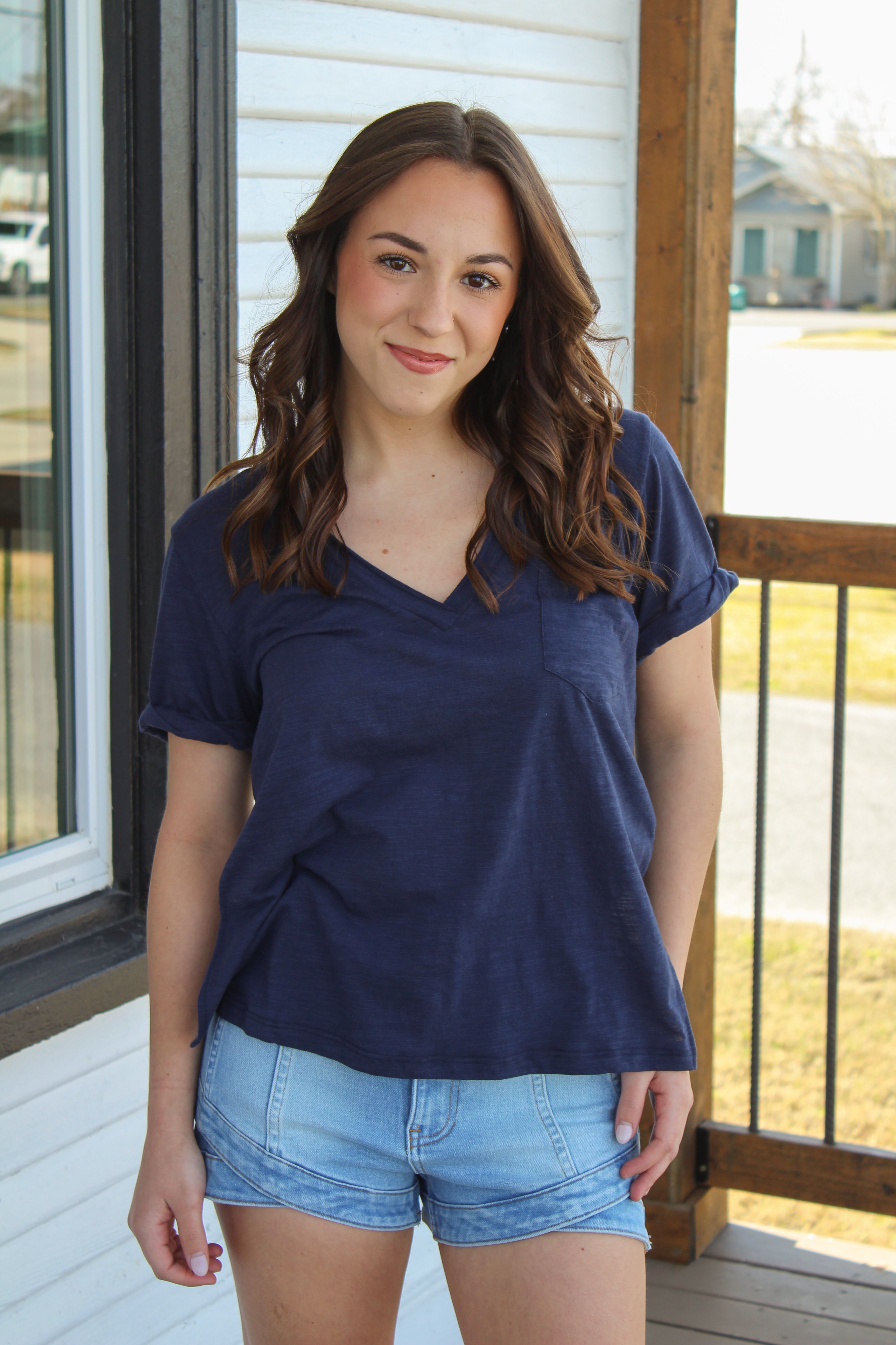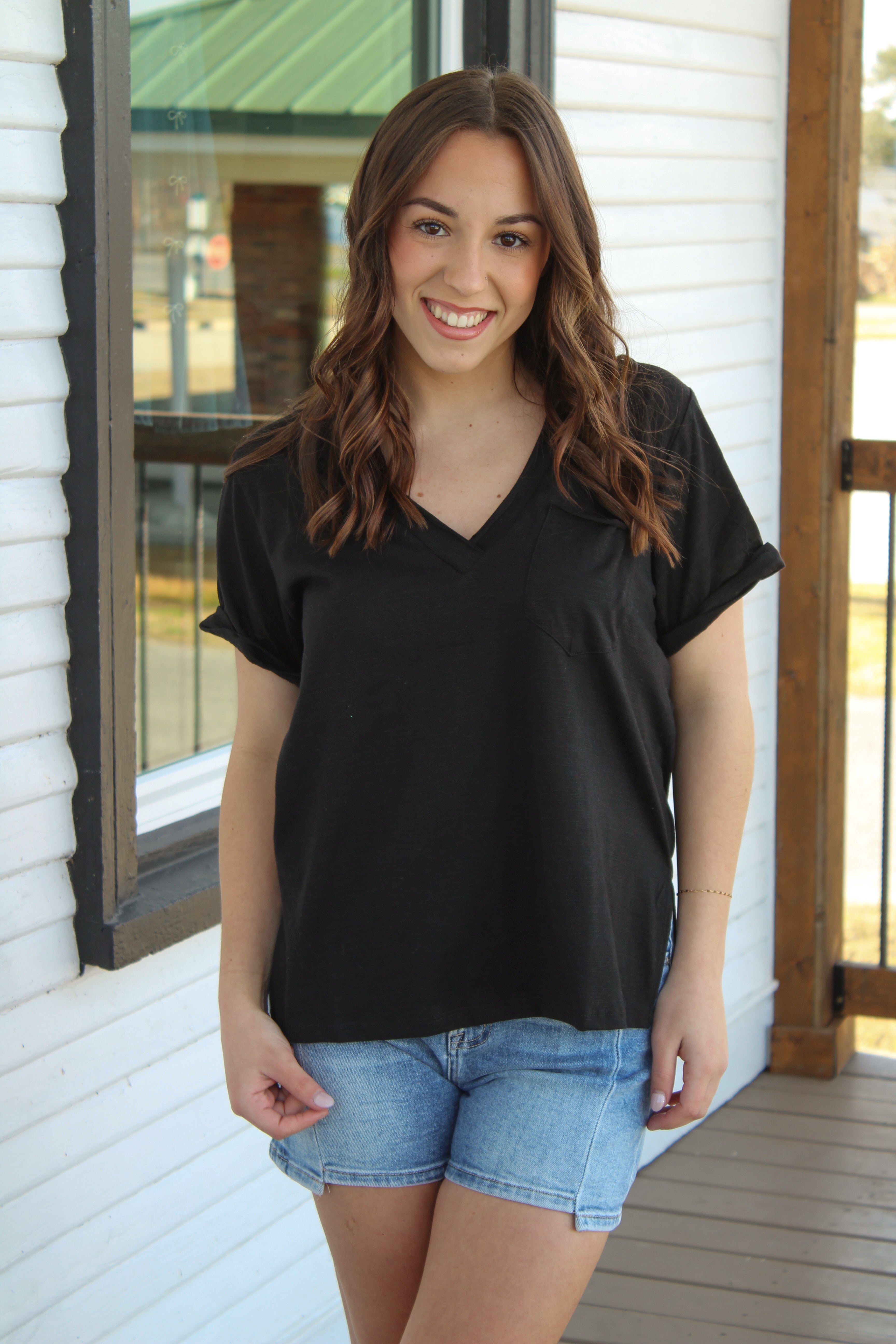 Experience comfort and effortless style with the Zoey V-Neck Top. The rolled short sleeves and raw seams add a touch of uniqueness to the basic v-neck tee, giving it a lived-in look. Perfect for any casual occasion, this top will keep you feeling comfortable and looking chic.
