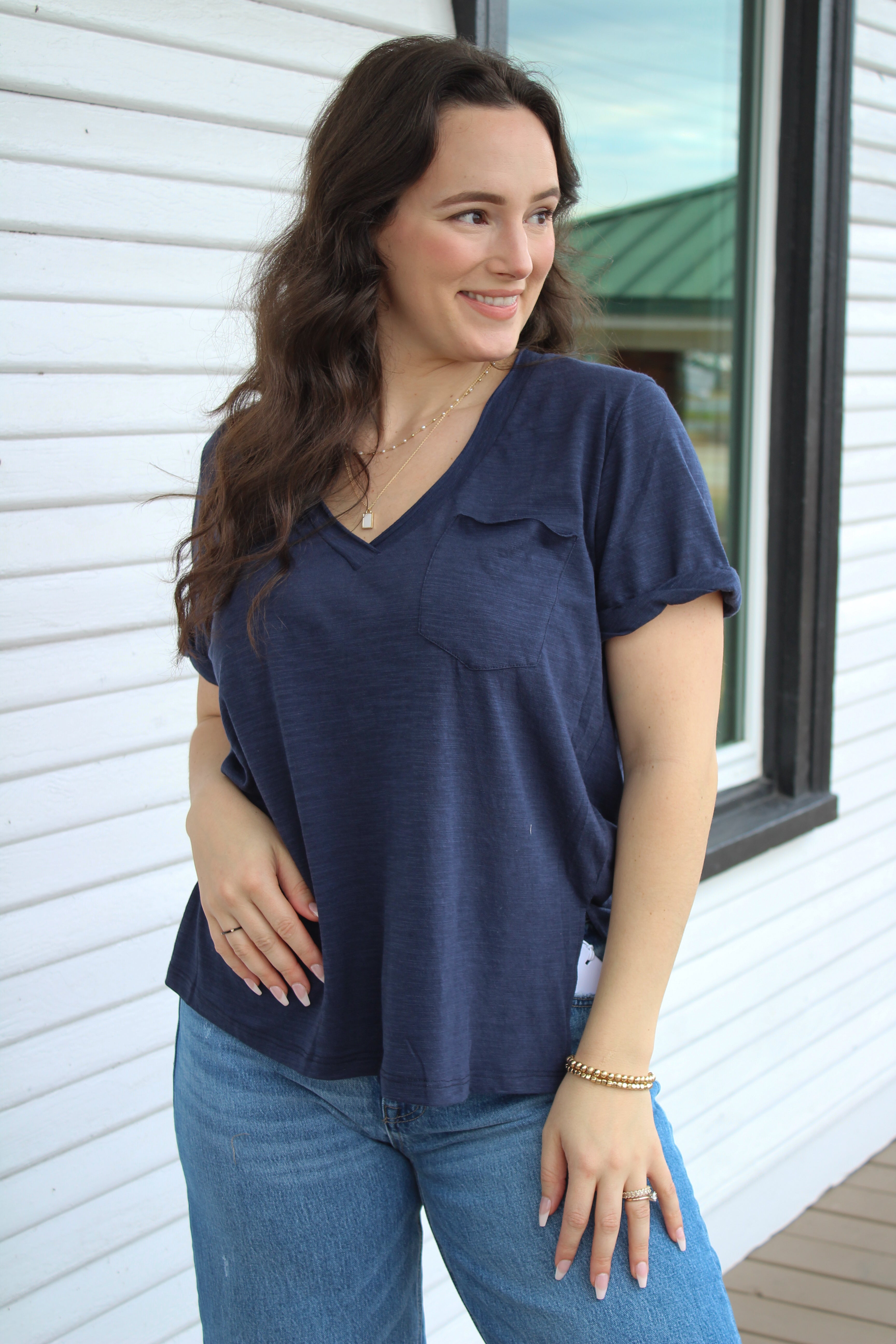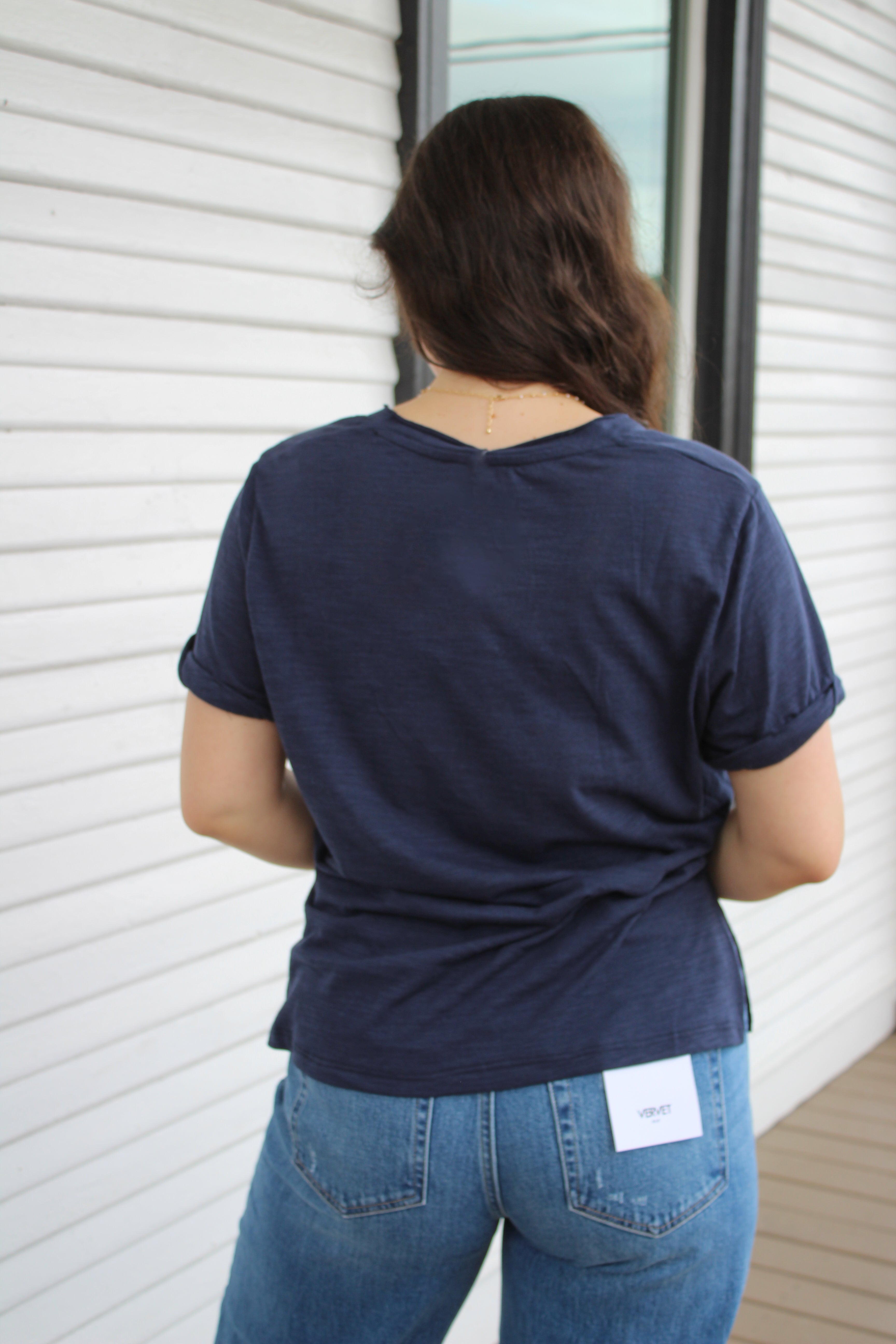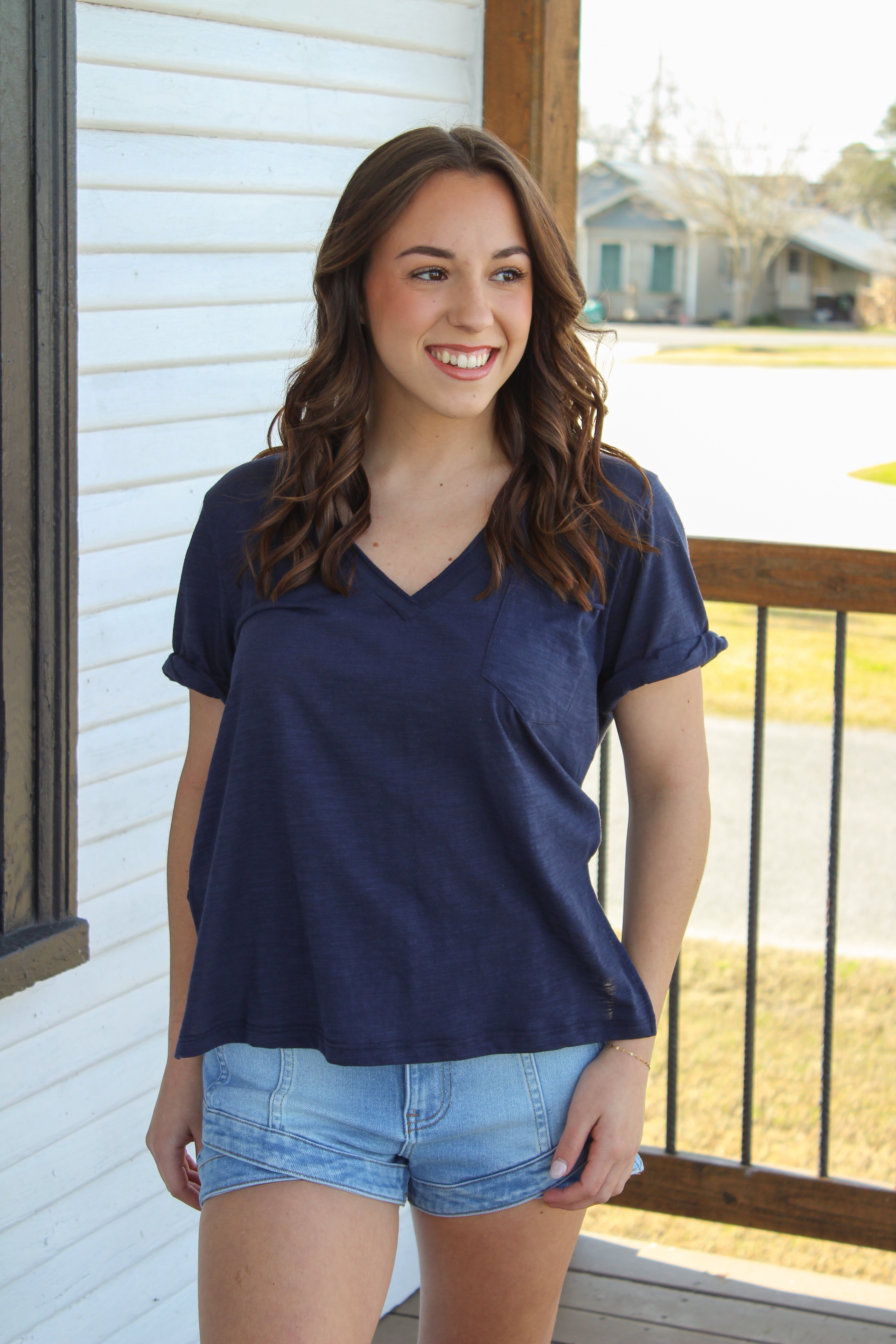 Experience comfort and effortless style with the Zoey V-Neck Top. The rolled short sleeves and raw seams add a touch of uniqueness to the basic v-neck tee, giving it a lived-in look. Perfect for any casual occasion, this top will keep you feeling comfortable and looking chic.